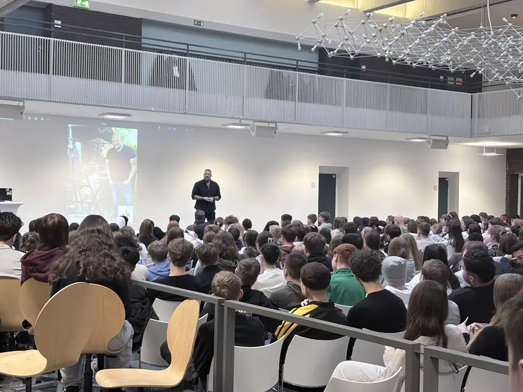 Am Donnerstag, den 22.01.2026, besuchte Philip Schlaffer, ein ehemaliger Rechtsextremer und heutiger Aussteiger, die Gesamtschule Oelde, die dem Netzwerk „Schule ohne Rassismus – Schule mit Courage“ angehört. Die Durchführung der Veranstaltung wurde dabei von der Schülervertretung (SV) unterstützt, die sich im Rahmen ihrer schulischen Arbeit aktiv für Demokratie, Toleranz und ein respektvolles Miteinander einsetzt. Gefördert wurde der Besuch von Herrn Schlaffer durch das Schulförderprogramm des Kreises Warendorf „Demokratie leben lernen“.