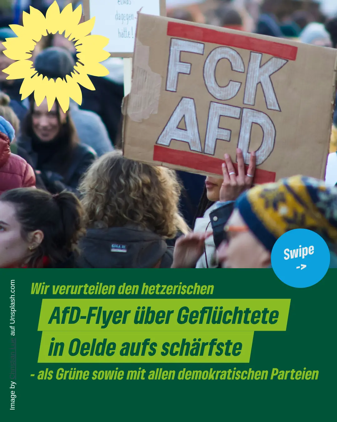 Beim Blick in den Briefkasten mussten derzeit viele Oelderinnen und Oelder mit Erschrecken feststellen, auf welch abscheuliche Weise Papier verschwendet werden kann. „Millionen für Fremde, kein Geld mehr für die Oelder Bürger“ titelt die AfD-Fraktion im Oelder Stadtrat unter dem Deckmantel ihres Kreisverbands auf höchst populistische und menschenverachtende Weise auf einem Flyer. Zugunsten des eigenen Vorteils versucht die AfD gezielt, „das eigene Volk“, in diesem Fall uns Oelderinnen und Oelder, gegen Geflüchtete und Migranten aufzuhetzen.
