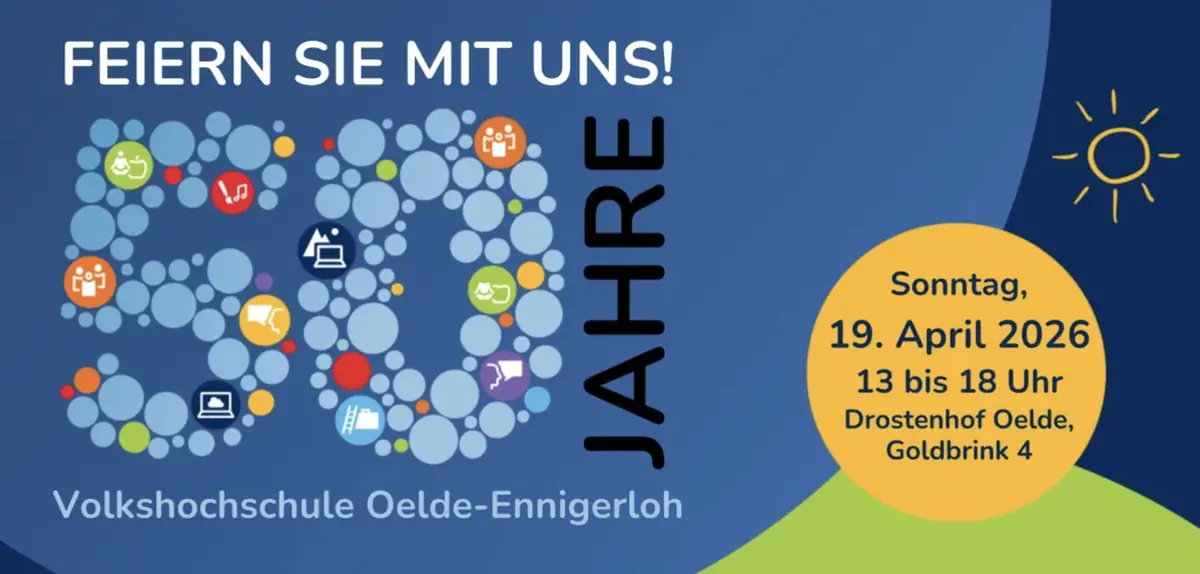 Die Stadt Oelde und die Volkshochschule Oelde-Ennigerloh laden am Sonntag, 19. April, von 13 bis 18 Uhr zu einer großen Feier auf den Drostenhof, Goldbrink 4, ein. Im Mittelpunkt stehen das 50jährige Jubiläum der VHS und der zweite Oelder Nachhaltigkeitstag. Besucherinnen und Besucher dürfen sich auf einen Tag voller Inspiration und Entdeckungen freuen.