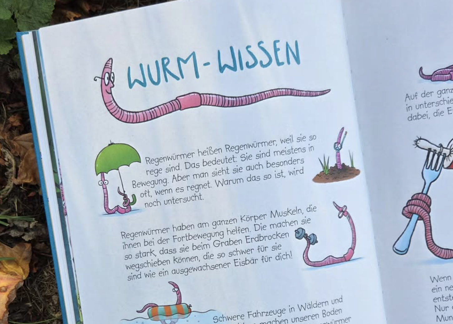 Die Geschichte wird in Reimform erzählt und ist voll von spannenden Sachinformationen über Regenwürmer. Die Kinder (und Erwachsenen) lernen hier sehr viel über diese regen, nützlichen Tierchen. Die zum Ende hin immer wimmeligeren Illustrationen ergänzen durch viele Details - sie zeigen, worum die Würmer sich kümmern und was sie in der Natur alles erreichen. Hier gibt es viel zu entdecken, u.a. auch im Hinblick auf Themen wie Umweltverschmutzung und erneuerbare Energien. Ganz hinten im Bilderbuch gibt es dann noch eine Doppelseite mit Wurm-Wissen - dort erfahren wir noch viel mehr Interessantes über Würmer.