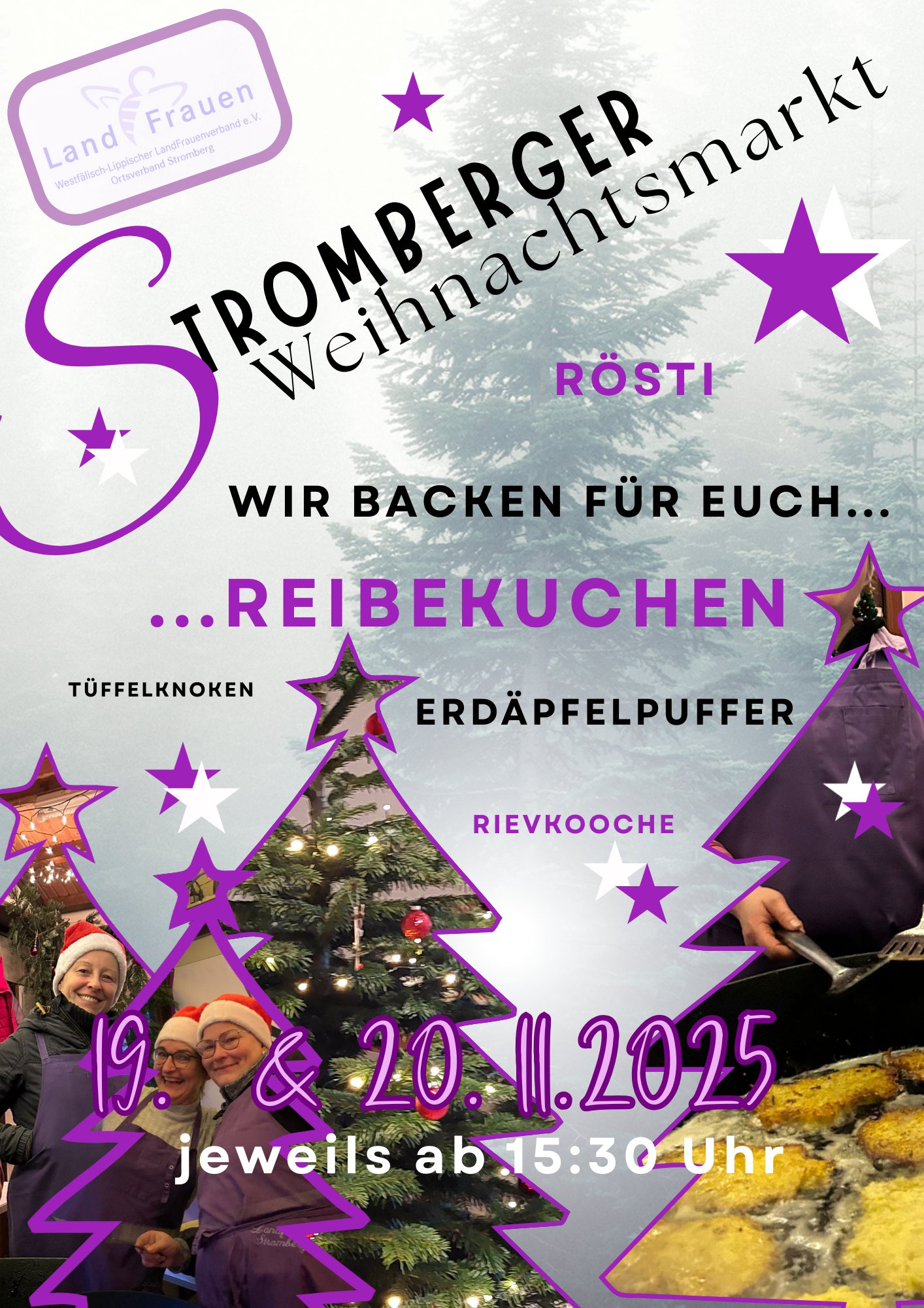 Am 19. & 20.12.2025 backen wir für Euch REIBEKUCHEN auf dem Stromberger Weihnachtsmarkt. Jeweils ab 15:30 findet ihr uns direkt auf dem Stromberger Marktplatz. Wir freuen uns auf Euch ... und in diesem Jahr stellen wir Euch unsere neuen LECKEREIN vor... seid gespannt. Bis zum 19.12.2025!!!
