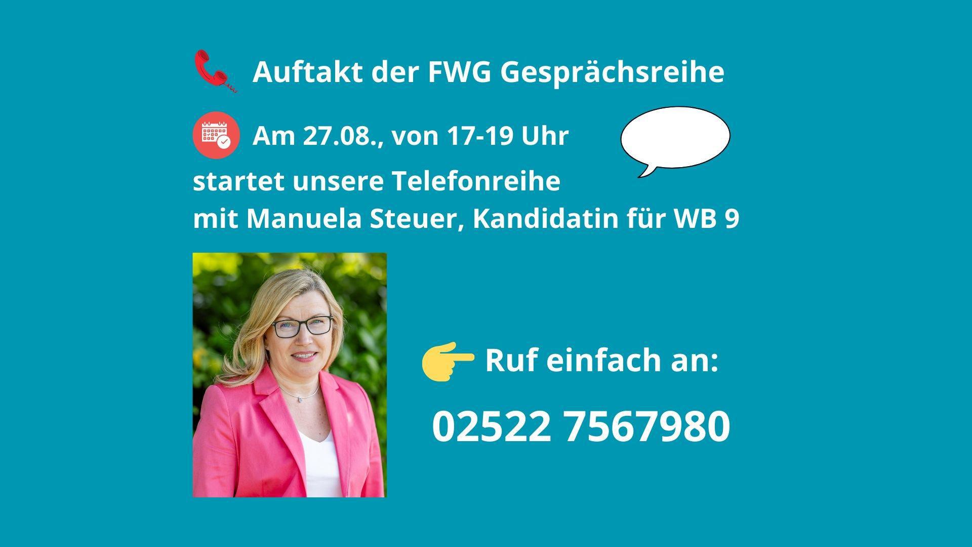 Den Auftakt macht Manuela Steuer, FWG-Fraktionsvorsitzende und Kandidatin im Wahlbezirk 9, am Mittwoch, 27. August 2025, von17:00 bis 19:00 Uhr unter der Telefonnummer 02522 7567980.