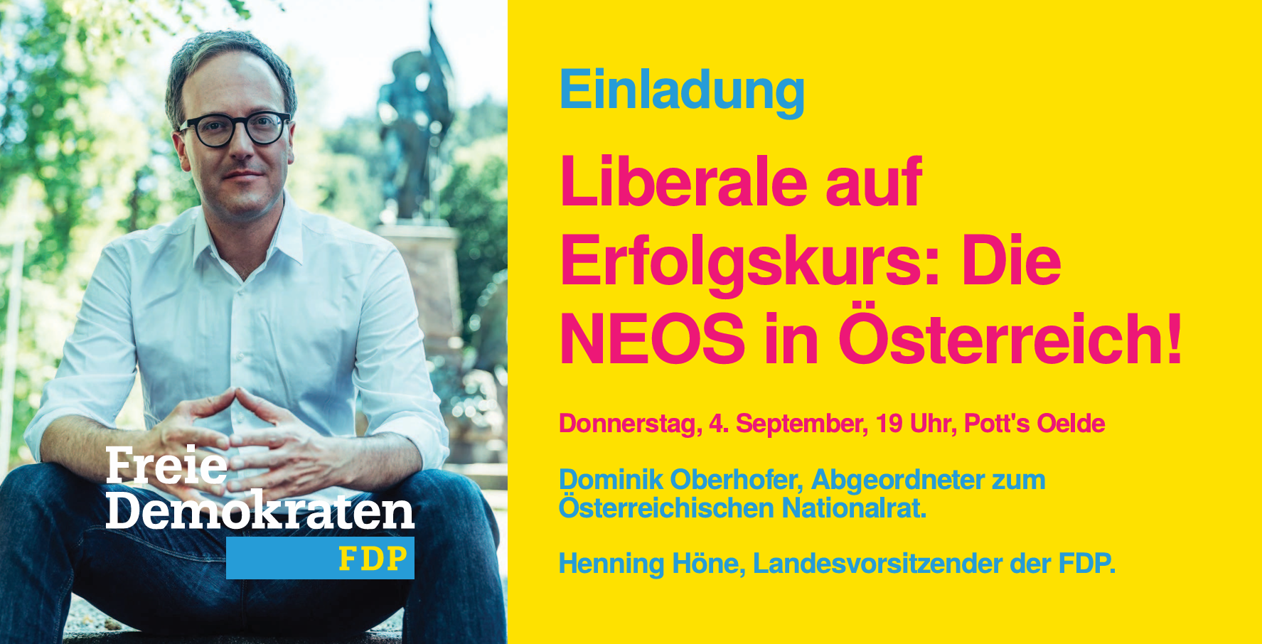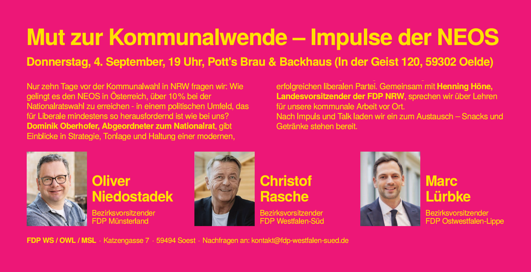 Am Donnerstag, 4. September 2025 haben die FDP Bezirksverbände Münsterland, Ostwestfalen sowie Westfalen-Süd ab 19.00 Uhr auf den Malzboden der Potts-Brauerei eingeladen. Dominik Oberhofer, österreichischer Nationalratsabgeordneter für unsere österreichische Schwesterpartei "Die Neos" wird dort zunächst einen Impulsvortrag unter dem Titel "Liberale auf Erfolgskurs: Die NEOS in Österreich!" halten und anschließend mit dem Landesvorsitzenden der FDP NRW Henning Höne MdL darüber sprechen, welche Schlussfolgerungen die Freien Demokraten in Deutschland für die kommunale Arbeit vor Ort ziehen können. Alle interessierten Oelder Bürgerinnen und Bürger sind zu dieser Veranstaltung ebenfalls herzlich eingeladen.