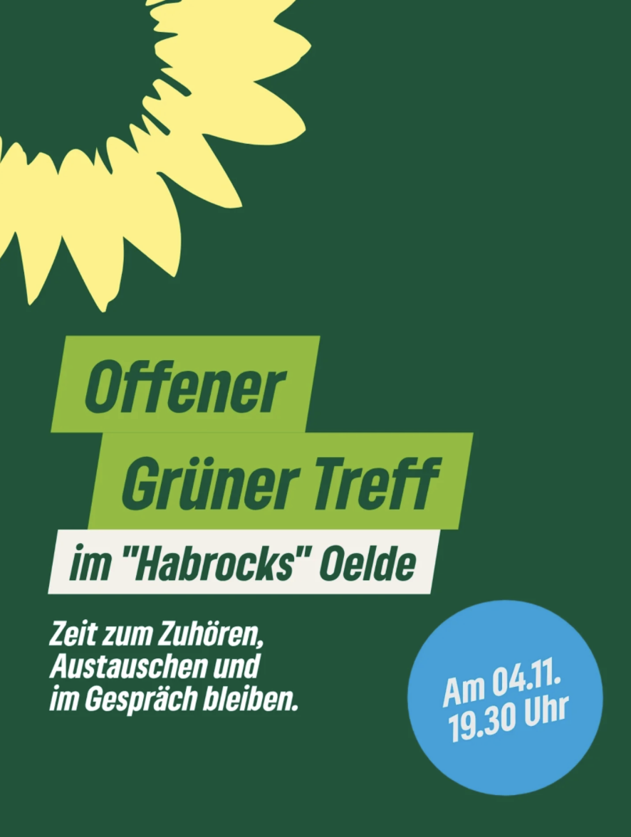 Die Grünen Oelde laden alle Interessierten zum nächsten Offenen Grünen-Treff am 04.11. um 19.30 Uhr im Habrocks ein. Kommt gerne vorbei und kommt mit in einen lockeren Austausch!