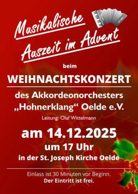 Auch in diesem Jahr lädt das Akkordeonorchester „Hohnerklang“ Oelde e.V. zu einer „musikalischen Auszeit im Advent“ in die St. Joseph Kirche in Oelde ein.Lehnen Sie sich zurück und lassen Sie sich durch die außergewöhnliche Atmosphäre und Akustik der Kirche von den Klängen des Orchesters verwöhnen.Beginn ist um 17 Uhr, Einlass ab 16.30 Uhr.Der Eintritt ist kostenfrei.