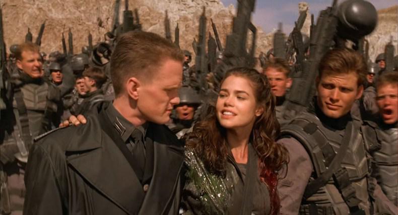 Casper Van Dien (Rico), Denise Richards (Carmen) und Dina Meyer (Dizzy) sehen aus, als kämen sie direkt aus einer kalifornischen Teenager-Serie wie Beverly Hills, 90210. Sie sind makellos, fast künstlich schön. Verhoeven nutzt dieses Image, um die Austauschbarkeit der Soldaten zu zeigen. In der Ideologie der Föderation ist das Individuum nichts, der Körper nur Material für den Staat. Wenn diese „perfekten“ Menschen im Kampf zerfetzt werden, entsteht ein grotesker Bruch: Die saubere Werbewelt trifft auf die blutige Realität des Krieges.