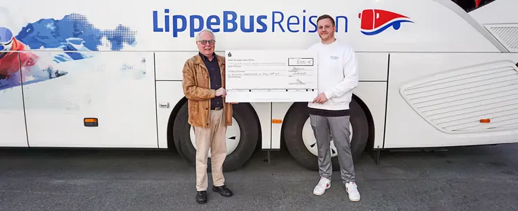 Das Bild zeigt Pfarrer em. Wolfgang Bovekamp (links) und einen der beiden Geschäftsführer von LippeBus Ruhkamp-Reisen, Sebastian Schröder, bei der Präsentation des symbolischen Spendenschecks auf dem Betriebshof der Spenderfirma in Beckum.