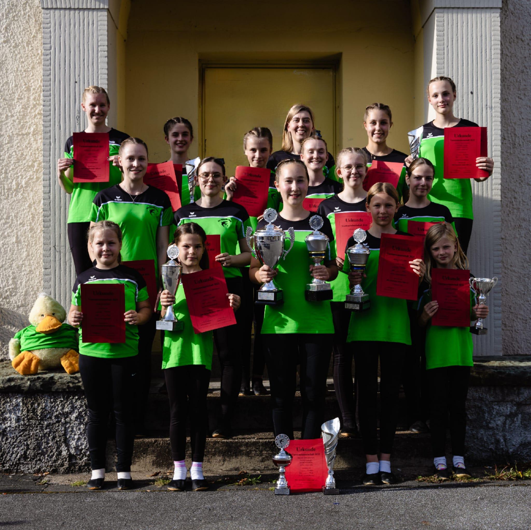 Nun folgten die jüngsten Sportlerinnen. In der Altersklasse der Schülerinnen U11 startete als erste Lina Averbeck. Sie stellte 4,60 Punkte auf und fuhr 4,60 Punkte aus.Ihr folgte mit 13,09 Punkten von aufgestellten 17,40 Punkten Eva Stoffers. Matilda Erdmann fuhr 20,41 von 22,80 Punkten aus. Damit wurde sie beste Schülerin U11. In der nächsten Altersklasse, den Schülerinnen U13 stellte Lucie Selhorst 22,00 Punkte auf und fuhr 19,38 Punkte aus. Damit wurde sie beste Schülerin U13. Bei den Schülerinnen U15 ging es als erste für Fiona Walter auf die Fläche. Sie reichte 27,20 Punkte ein und fuhr 22,28 Punkte aus. Mit 22,90 Punkten folgte Mara Wiewel. Sie errang noch 23,12 Zähler. Amy Winter stellte 39,90 Punkte auf. Es blieben zum Schluss noch 35,34 Punkte. Mit 42,50 Punkten ging es für Greta Napierala vor das Kampfgericht. Es blieben noch 34,44 Zähler stehen. Hanna Cieslukowski reichte 46,20 Punkte ein. Sie erfuhr 45,23 Punkte und wurde damit direkt beste Schülerin U15 und Vereinsmeisterin.