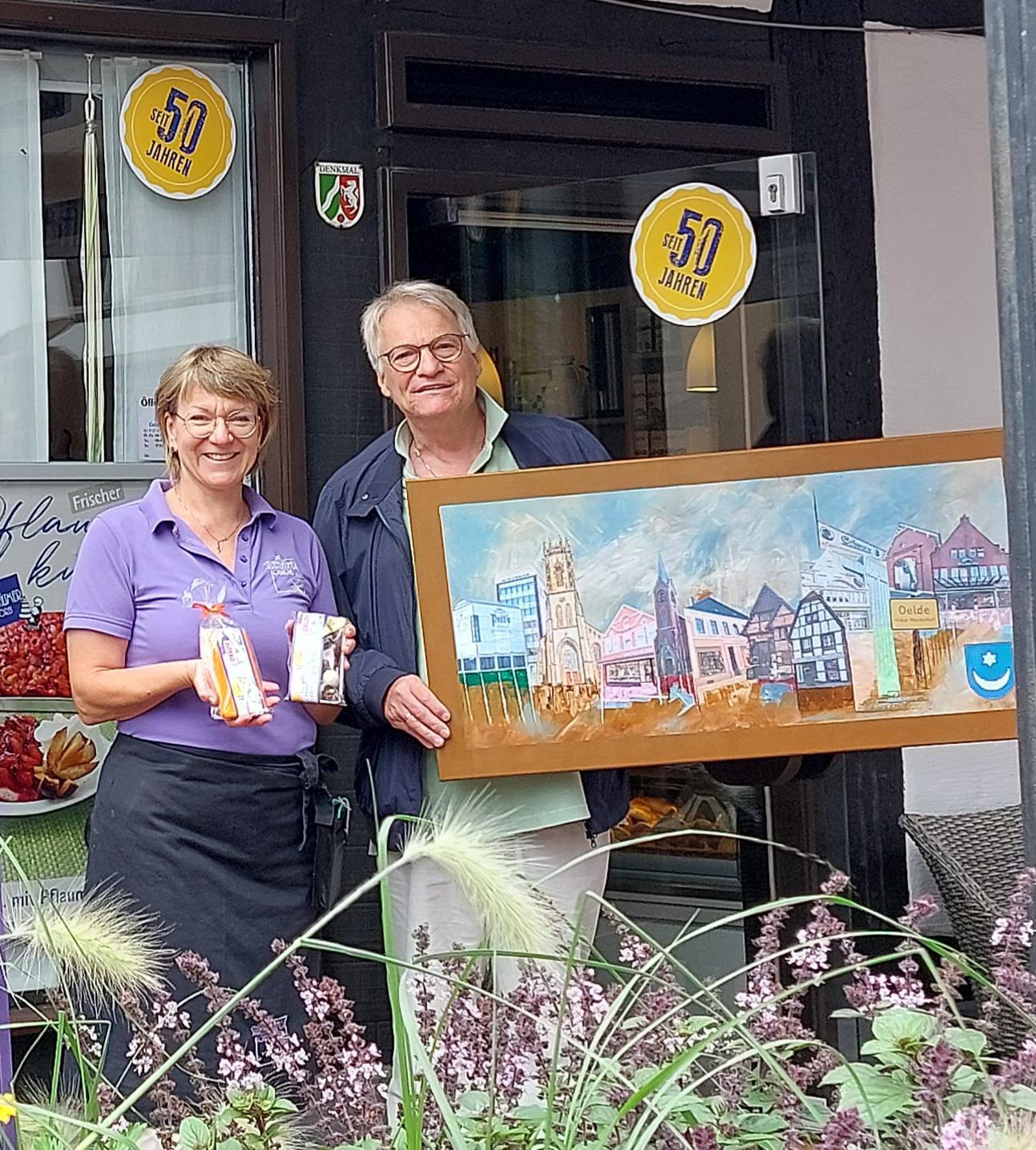 Konditormeister Martin Stutenbäumer hat extra für die neue Produktlinie „Süße Grüße aus Oelde„ eine feine neue Schokolade erschaffen: Belgische Zartbitterschokolade verfeinert mit gesalzenen und karamellisierten Kürbiskernen. Diese Kreation ist etwas ganz Besonderes und nur in der Konditorei Stutenbäumer erhältlich. Daneben finden die Gäste auch wieder die bekannten und beliebten hauseigenen Trüffel, ebenfalls geschmückt mit der eigens für Oelde gestalteten Banderole. Jetzt ist das Sortiment „Süße Grüße aus Oelde“ endlich komplett, bestehend aus den beliebten Axtbachmuscheln, Kuchen im Glas in verschiedenen Geschmacksrichtungen, handgegossener Schokolade und Trüffeln aus Meisterhand. Damit es im Cafe in der Herbst- und Winterzeit auch weiterhin gemütlich ist, wurde das Cafe mit Bildern einer neuen Kunstausstellung geschmückt. Diesmal handelt es sich bei dem Künstler um einen gerngesehenen Gast des Hauses, Kurt Huse, der seine Werke im Cafe ausstellt. Kurt Huse war 45 Jahre lang selbstständiger Friseurmeister und auch hier natürlich immer gerne mit seinen Händen kreativ. Im Rentenalter ist dann das Malen mit Acrylfarbe zu seinem Hobby geworden. Alle, die nun neugierig auf die Bilder sind, können sich im Cafe Stutenbäumer bei leckerem Kuchen, frischen belegten Brötchen und duftendem Kaffee die Kunstwerke ansehen.