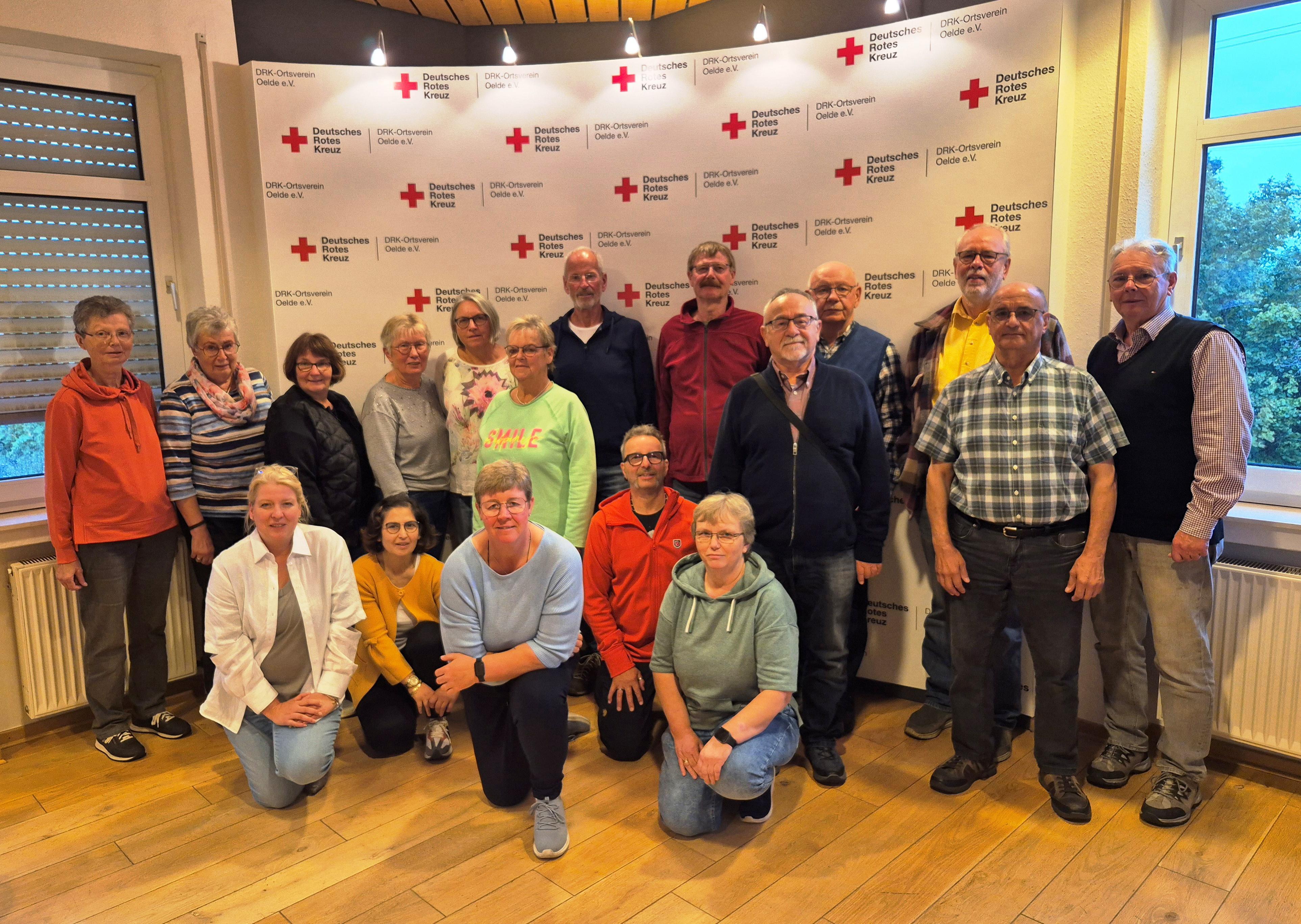 Am 16. September 2025 wurde im DRK-Haus des Oelder Ortsvereins die im Frühjahr gestartete Erste-Hilfe-Kampagne „DRK Notfall Update“ fortgesetzt, mit 16 Mitgliedern der Ehrenamtszentrale Oelde. Das Bild zeigt sie im Hintergrund sowie vorne links Oeldes DRK-Vereinsvorsitzende Melanie Westerbeck und die Sanitäts- und Erste-Hilfe-Trainerin Verena Bittner (vorne, 3.v.l.).