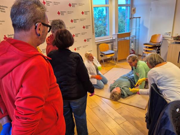 Verena Bittner, im Hauptberuf Schwimmmeisterin im Hallen- und Freibad in Verl, ist seit vielen Jahren ehrenamtlich bei der DLRG Verl, beim DRK in Oelde und als mobile Retterin im Kreis Gütersloh im Einsatz. Sie weiß, was im Ernstfall zu tun ist und demonstrierte zunächst an einer Puppe, dann an Freiwilligen aus der Gruppe, worauf es ankommt. Vor allem aber überzeugte sie die Teilnehmenden, die natürlichen Ängste beim Umgang mit Unfallopfern zu überwinden: „Ihr könnt nichts falsch machen, wenn ihr die wenigen Grundkenntnisse, die zum Helfen notwendig sind, praktisch umsetzt. Viel schlimmer ist es, aus Angst nichts zu tun. Und: Bleibt nah beim Verletzten, sprecht, beruhigt und reagiert rasch bei Ohnmacht oder Herzstillstand.“