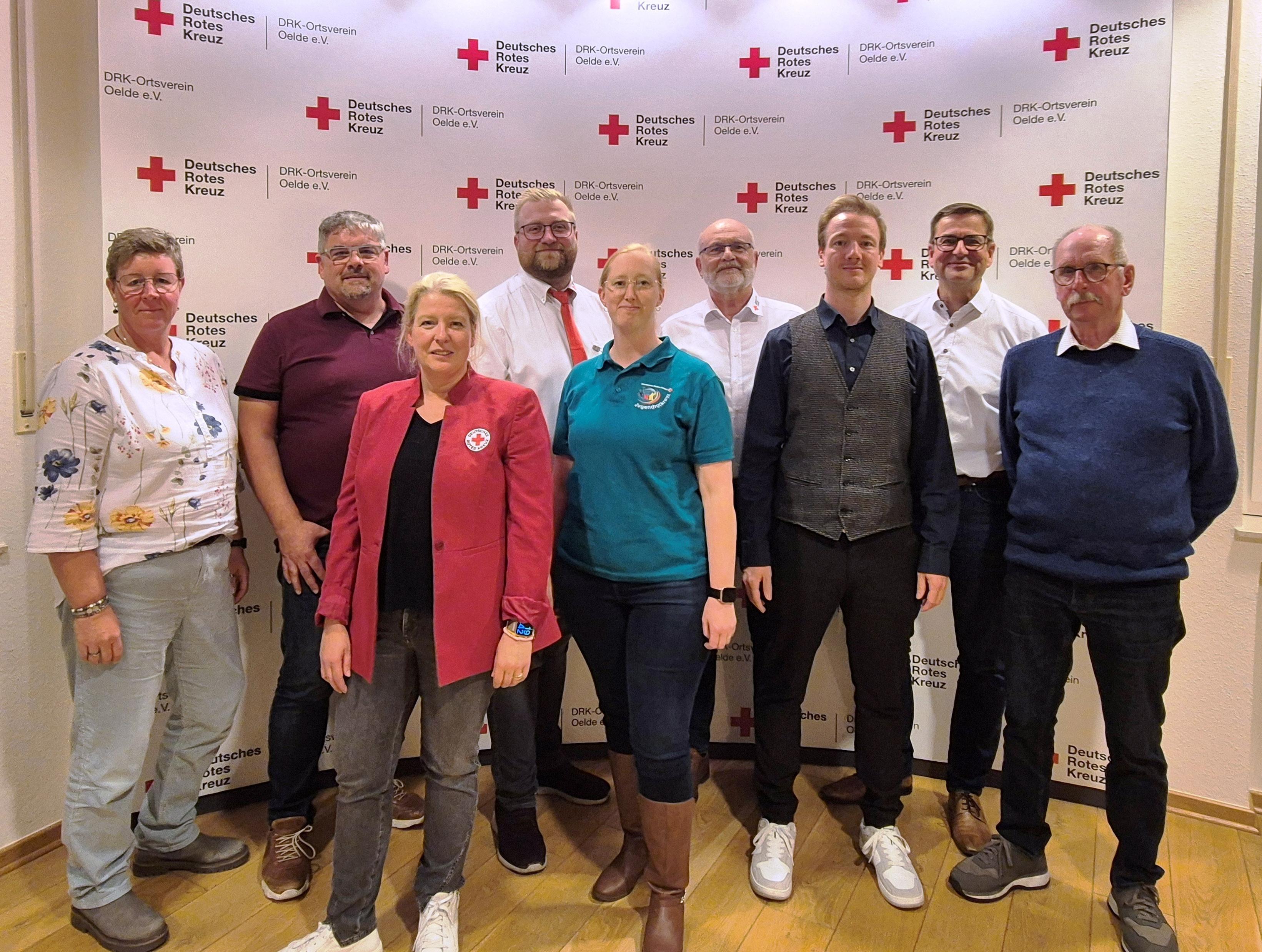 Die Vorstandsmitglieder des DRK-Ortsvereins Oelde nach der Mitgliederversammlung am 16. Oktober im DRK-Haus (v.l.): stv. RKL Verena Bittner, stv. DRK-Vorsitzender Ingo Baum, DRK-Vorsitzende Melanie Westerbeck, RKL Thomas Jeßulat, JRK-Leiterin Lisa Jeßulat, Schrift- und Pressewart Joachim Polzin, Beisitzer Jan Bräutigam, Schatzmeister Jürgen Schramm und Erwin Hellweg, Leiter AK Blutspende. Nicht auf dem Bild sind RKL Michaela Horstmann und stv. RKL Matthias Georgi. Foto: Hanna Wagener (DRK Oelde)