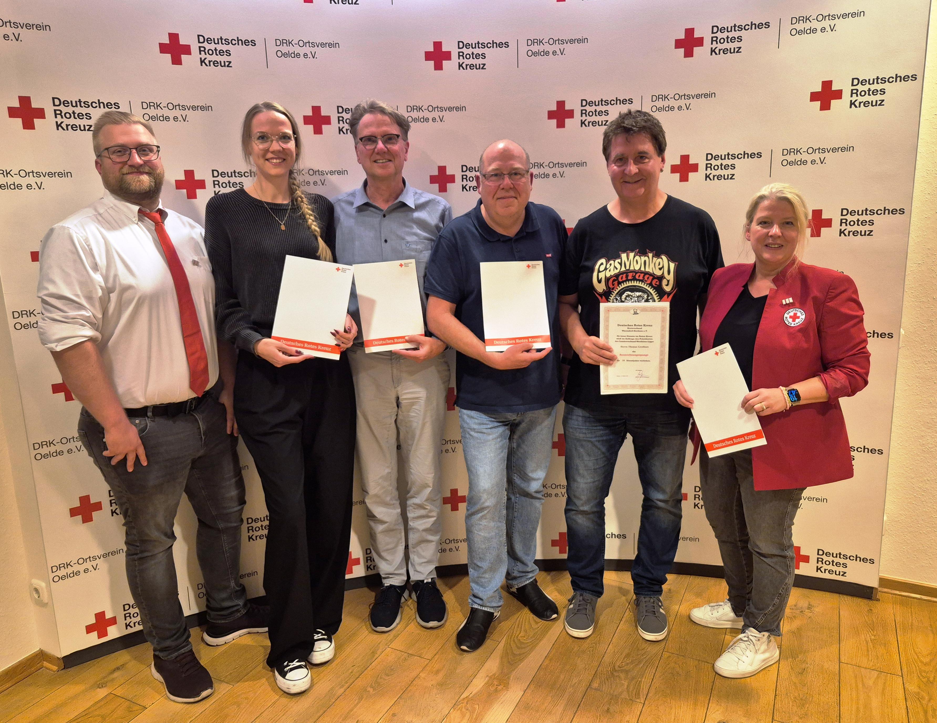 Oeldes DRK-Vereinsvorsitzende Melanie Westerbeck (rechts) und Rotkreuzleiter Thomas Jeßulat (links) ehrten für lange Mitgliedschaft: Delia Brömse (10 Jahre, 2.v.l.), Dr. Martin Nienhaus (20 Jahre, 3.v.l.), Markus Westerbeck (35 Jahre, 3.v.r.) und Thomas Grothues (10 Jahre, 2.v.r.). Auch die Vereinsvorsitzende selbst wurde mit einer Ehrenurkunde für 20-jährige Mitgliedschaft ausgezeichnet. Nicht auf dem Foto sind Sandra Fahlenbreder (10 Jahre) und Annette Baum (25 Jahre Mitgliedschaft). Foto: Joachim Polzin (DRK Oelde)