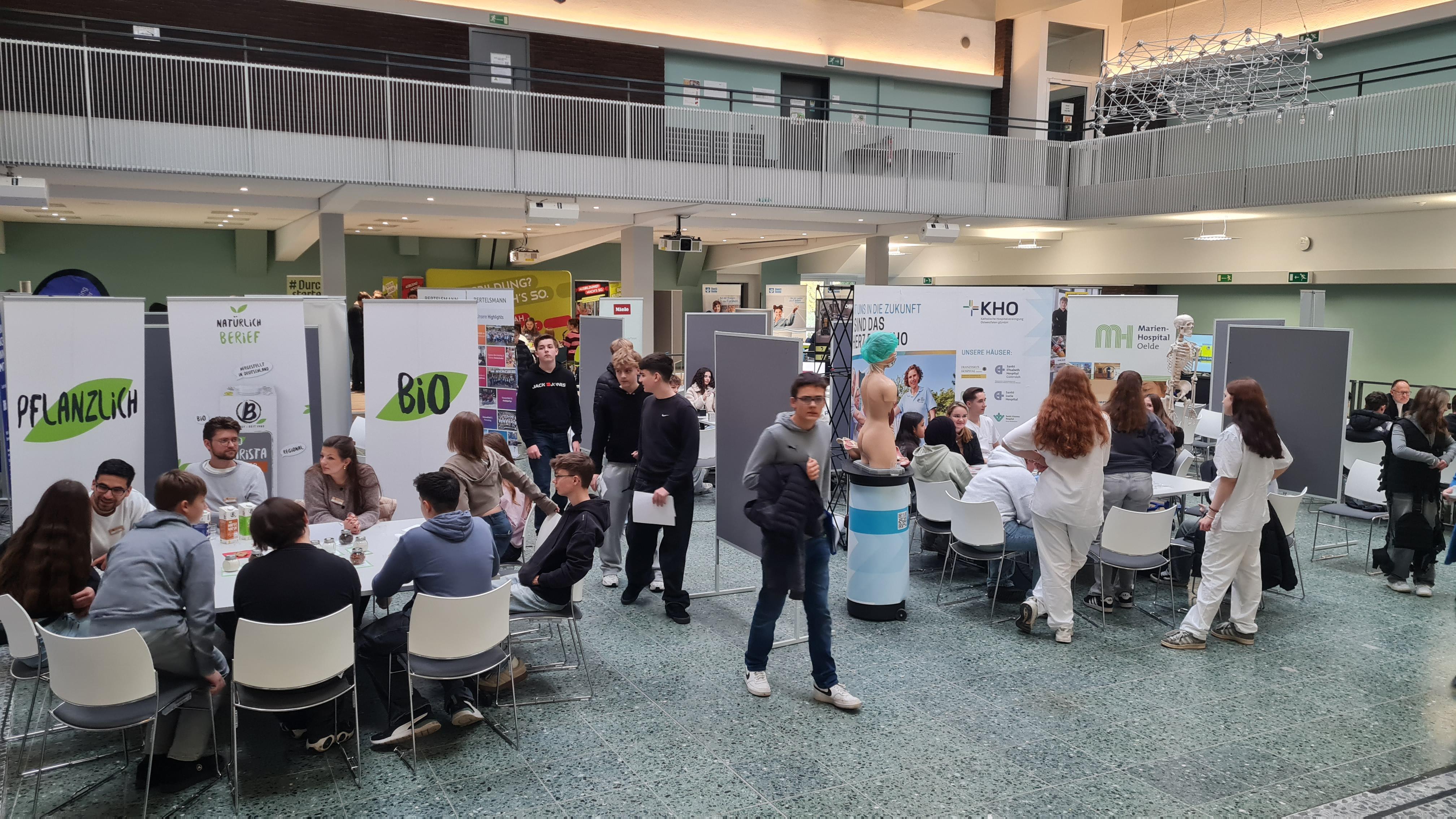25 verschiedene Unternehmen aus Oelde und der Umgebung kamen in zahlreichen Gesprächsrunden mit den knapp 240 Schülerinnen und Schülern in einen ersten Austausch. Diesen nutzten die jungen Leute, um sich über Praktikums- und Ausbildungsplätze sowie die Unternehmen im Allgemeinen zu informieren. „Ihr steht vor wichtigen Weichenstellungen in eurem Leben. Geht in die Gespräche, nutzt die Gelegenheit und informiert euch über mögliche Berufswege“, gab Schulleiter Mario Schmidt den Schülerinnen und Schülern vor Beginn des KarriereChats mit auf den Weg. Ob mit einem kleinen Quiz über das eigene Unternehmen, einem Körpermodell von der menschlichen Anatomie oder kleinen Schaltkreisen – die Ausbilder und Auszubildenen wussten die Schülerinnen und Schüler zu fordern. So kamen viele interessierte und angeregte Gespräche an den einzelnen Stationen der Unternehmen zustande. „Wir haben in diesem Jahr eine große Vielfalt an Branchen beim KarriereChat vertreten. Natürlich ist der Maschinenbau dabei, aber auch die Pflege, die Möbelbranche und der Bereich der Lebensmittelherstellung ist präsent“, betont Ole Schöning vom zdi-Netzwerk. Das Netzwerk hatte den KarriereChat gemeinsam mit der Gesamtschule Oelde organisiert.