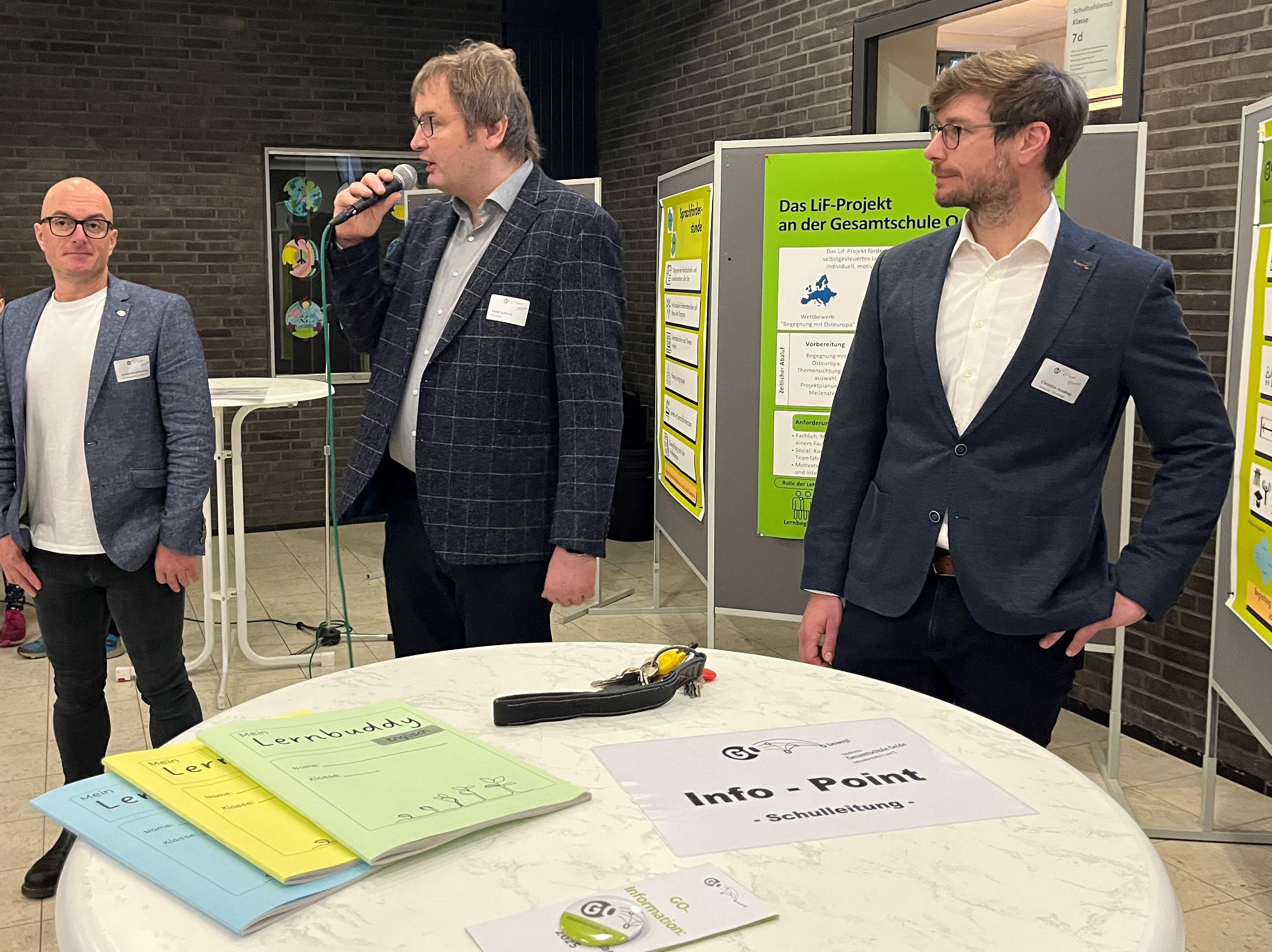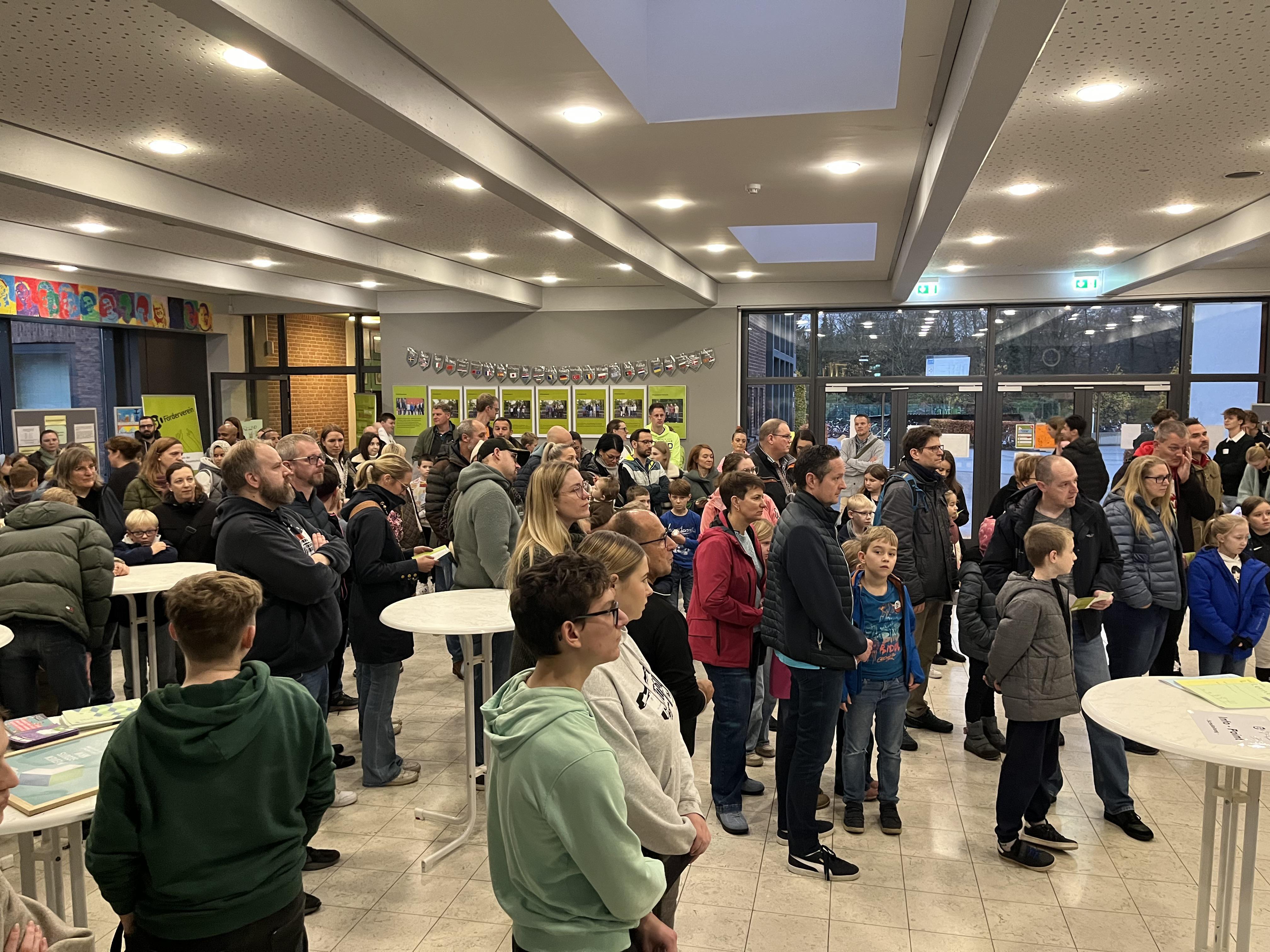Am Samstag, den 15.11.2025, öffnete die Gesamtschule Oelde erneut ihre Türen für Grundschülerinnen und Grundschüler und ihre Eltern, um ihnen einen lebendigen Eindruck vom Schulleben zu ermöglichen. Um den vielen Gästen gerecht werden zu können, hatten die Gäste im Vorfeld zwischen vier Anfangszeiten wählen können. Ab 8:00 Uhr und dann jeweils zur vollen Stunde führten Schülerinnen und Schüler der Oberstufe die Gäste durch die Schule. Bevor die Rundgänge starteten, nahm Schulleiter Mario Schmidt die Eltern und ihre Kinder im Foyer des Standortes am Düdingsweg in Empfang. Auch Abteilungsleiter André Schemmerling, der die Veranstaltung organisierte, richtete einige Worte an die Gäste und erklärte ihnen den Ablauf des Besuches.