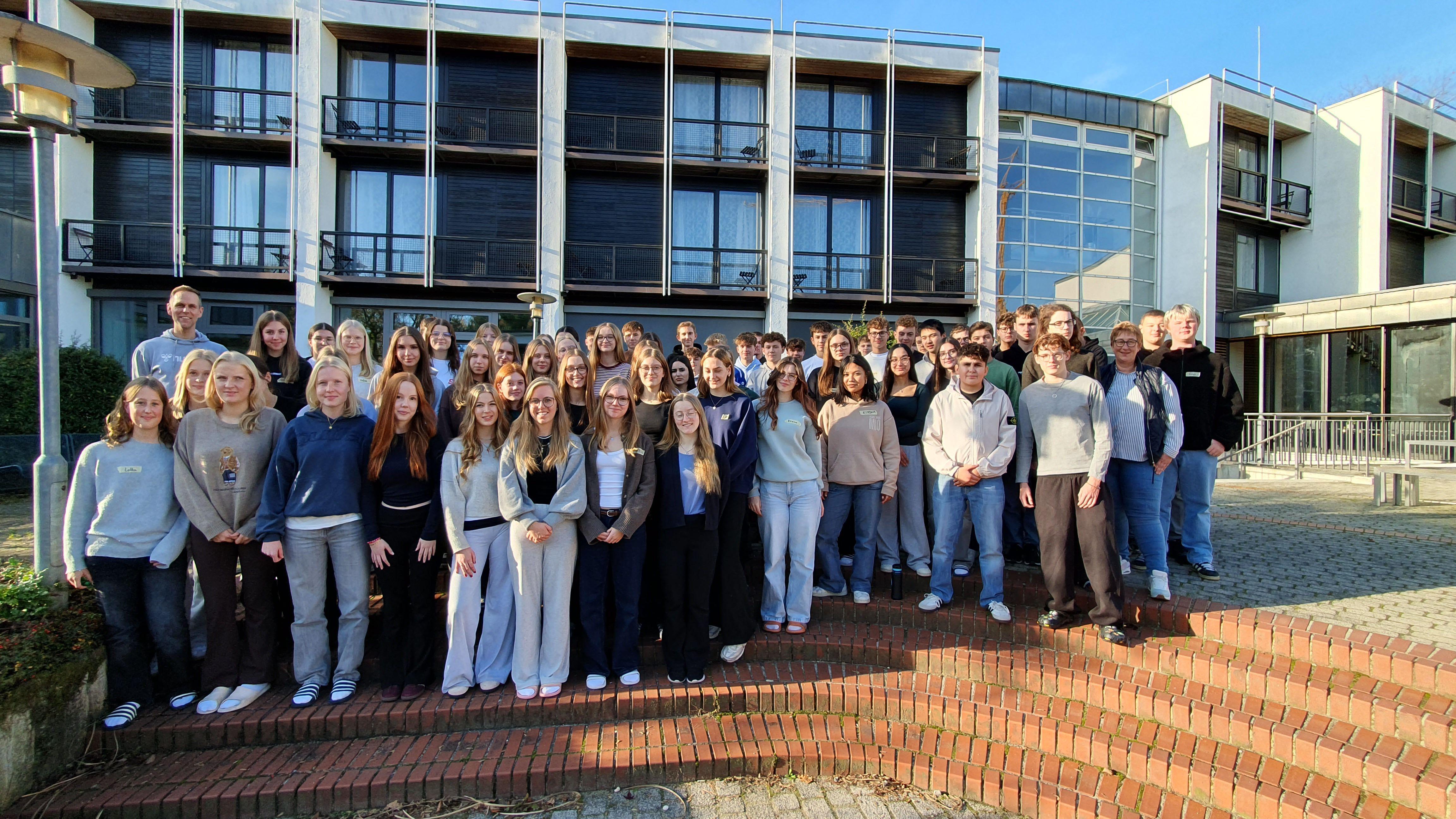 Das Bild zeigt die Schülerinnen und Schüler der Einführungsstufe des Thomas-Morus-Gymnasiums Oelde im Innenhof des Hauses Neuland in Bielefeld. Begleitet wurde die Stufe von ihren Beratungslehrkräften Christine Haese, Dirk Hanke und Michael Gunnemann.