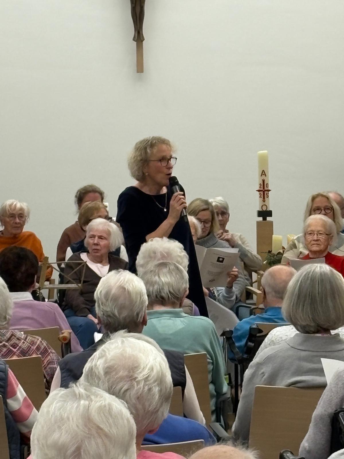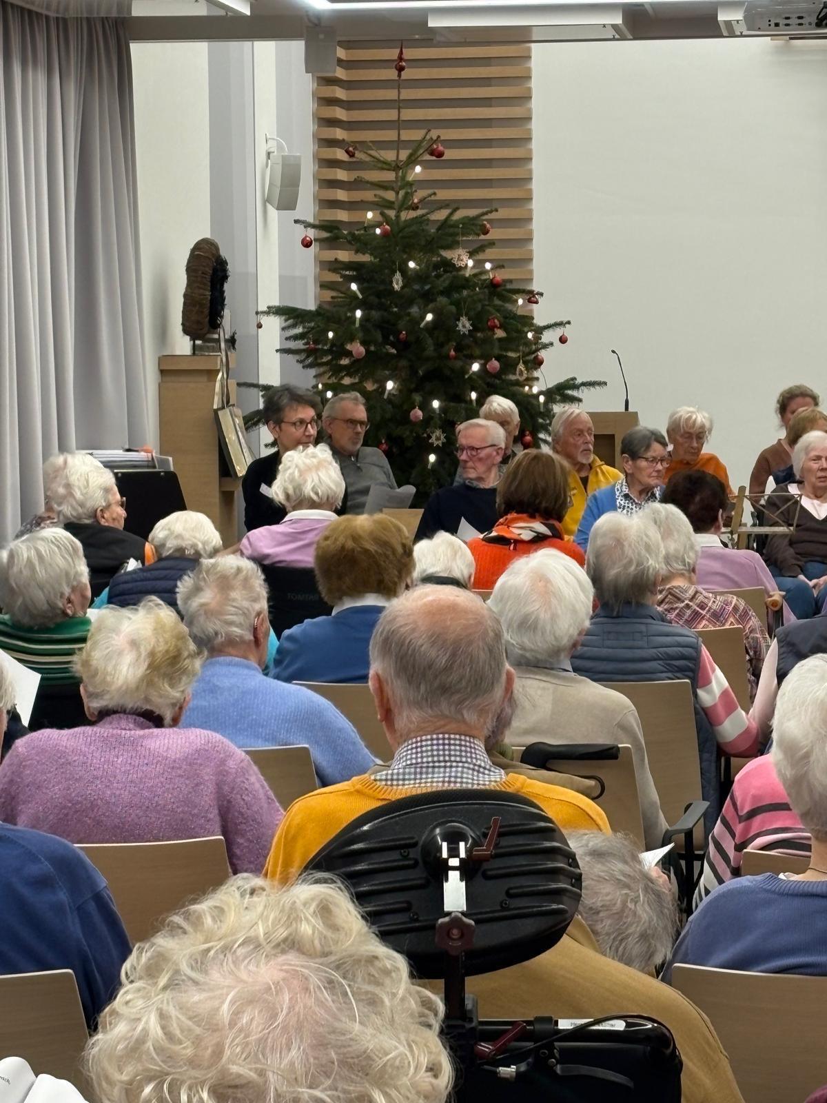 Jeden Freitag treffen sich ca. 20 Menschen im Saal des von-Galen-Hauses zum „Singen gegen das Vergessen“. So auch am Freitag vor dem 4.Advent. Diesmal fand das gemeinsame Singen in Gemeinschaft mit Bewohnern, Angehörigen, Mitarbeitenden und einem Blockflötenensemble statt. Nach dem Begrüßungslied „Freitag ist es nun schon wieder“, welches jedes Treffen eröffnet, wird es besinnlicher: die ruhige, wiegende Melodie des polnischen Liedes, welches den Mondschein besingt stimmt die Menschen auf das adventlich-weihnachtliche Programm ein.
