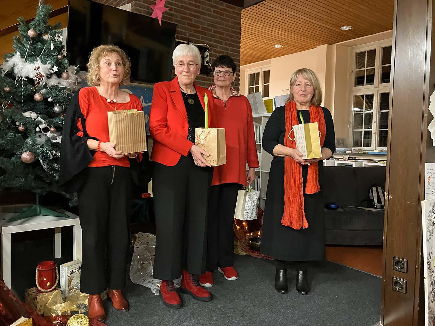 Der Vorstand des Freundeskreises der Stadtbücherei hat seinen Mitgliedern im Rahmen der diesjährigen Weihnachtsfeier eine Überraschung beschert: Die Märchenerzählerinnen vom Erzählkreis Hamm waren zu Gast in der Stadtbibliothek. Das Motto der vier Damen vom Erzählkreis Hamm ist, Märchen und Geschichten mit der Stimme einen Klang zu geben. Das Besondere: eine lebendig-authentisch humorvolle Präsentation von Märchen und Geschichten für Erwachsene. Es wird nicht vorgelesen, sondern frei erzählt. Jede Erzählerin trägt Geschichten in kunstvoller, mal wortgetreuer oder neu ausgelegter Form vor. Der Vortragsbogen spannt sich vom Nikolausgeschenk, der Pullover-Gans, über den Stutenkerl Laurentius, der eine Frau will bis zum Baumwollfaden.