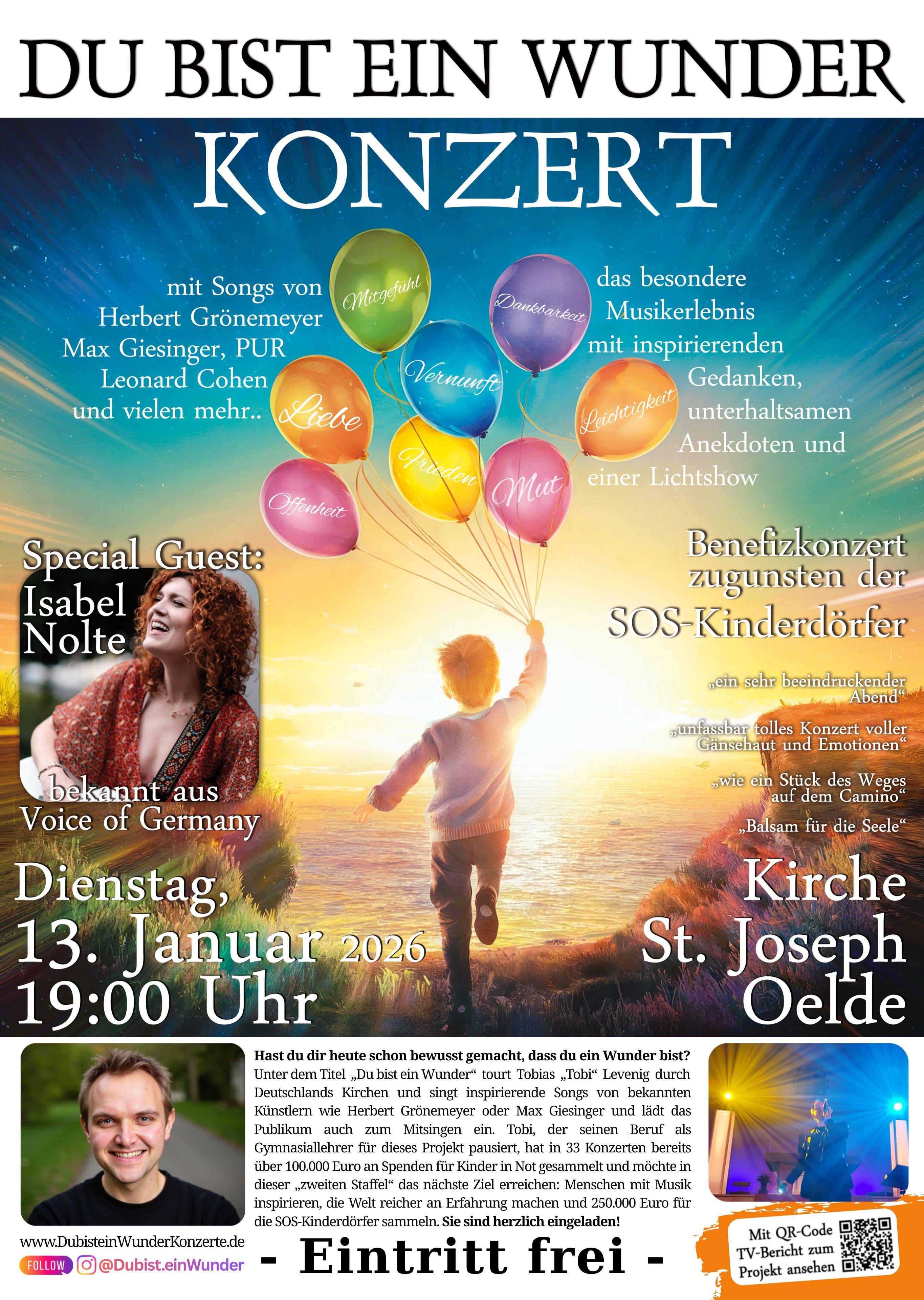 Am Dienstag, 13. Januar 2026, um 19.00 Uhr, wird herzlich in die Kirche St. Joseph Oelde zu einem ganz besonderen Abend eingeladen: dem Benefizkonzert „Du bist ein Wunder“ zugunsten der SOS-Kinderdörfer. Der Eintritt ist frei.