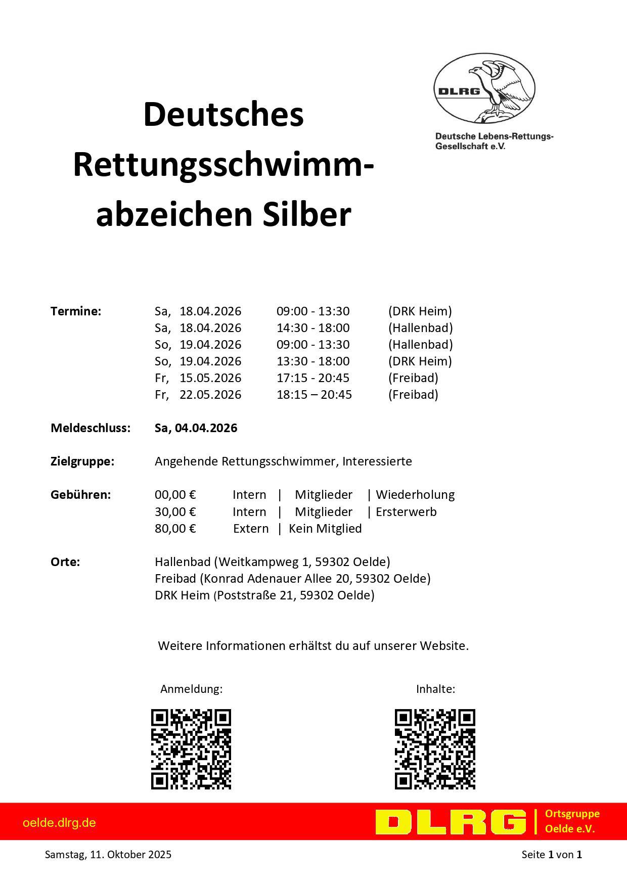 Egal ob Anfänger*in oder Wiederholer*in – wir bieten im Zeitraum vom 18.04. bis 22.05.2026 einen DRSA-Silber-Kurs an.