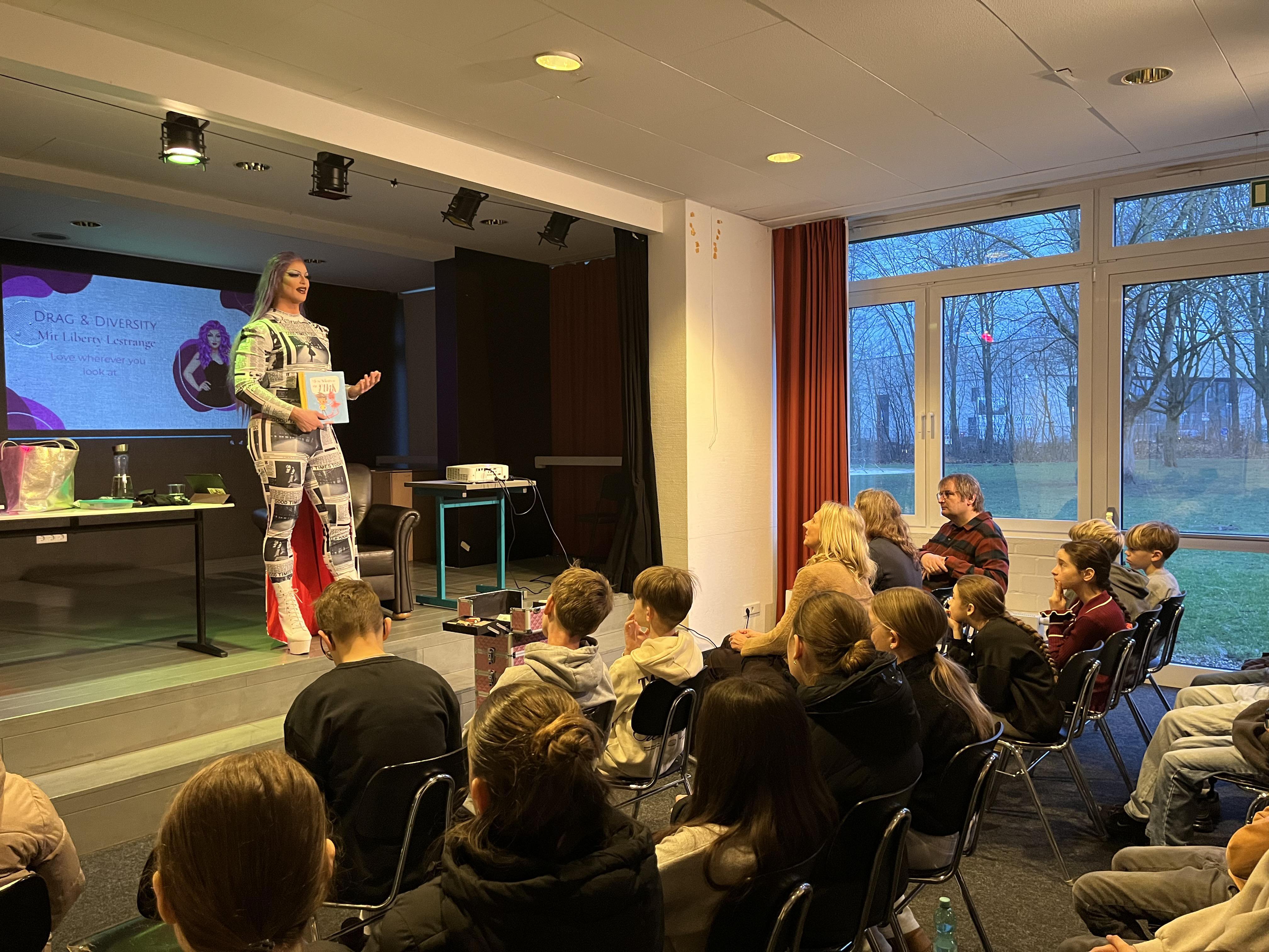 Im Rahmen des Unterrichts zur Sexualerziehung nach den Richtlinien des Landes NRW war an zwei Freitagen, dem 23.01.26 und dem 30.01.26, die Drag Queen Liberty Lestrange an unserer Gesamtschule zu Gast. Die Veranstaltungen waren pädagogisch vorbereitet und wurden von Lehrkräften und Mitgliedern der Schulleitung begleitet.