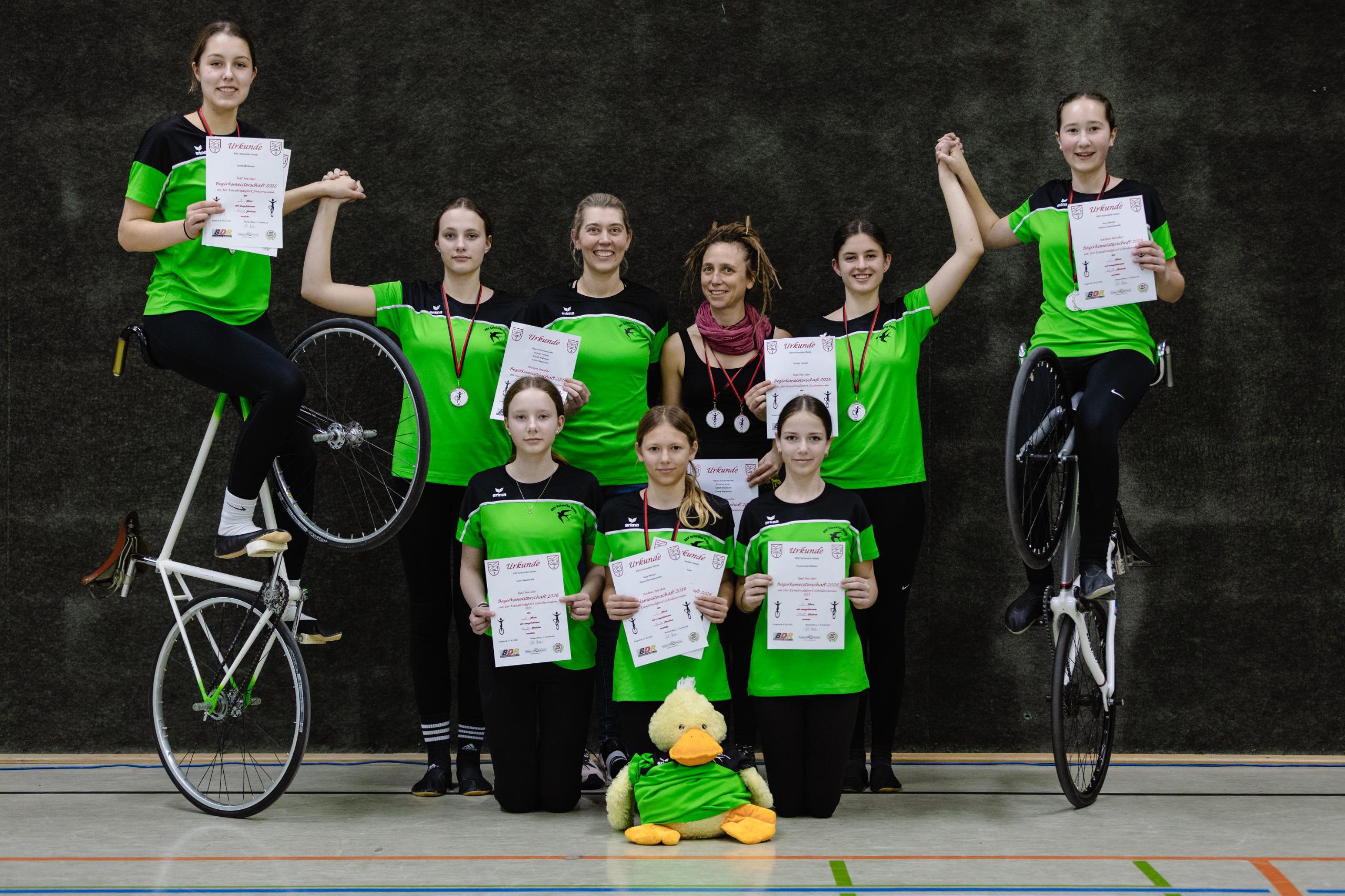 Die Oelder Juniorinnen starteten zum Schluss noch in der Klasse des 4er Kunstradfahren. Die Aufregung vor dem Start war groß, den es sollte nicht nur um eine Medaile gehen. Auf der Wettkampffläche zeigten die vier Juniorinnen dann ein starkes Programm. Nach fünf Minuten standen noch 54,54 Punkte von zuvor eingereichten 71,70Punkten auf der Anzeigentafel. Damit ging die Silbermedaile und eine Qualifikation nach Oelde. Im März darf die Oelder Kunstradmannschaft dann auf der Landesmeisterschaft der Juniorinnen in Neersen starten. Trainerin Verena Overbeck war angesichts dieser tollen Leistung besonders stolz auf die Juniorinnen Mannschaft.