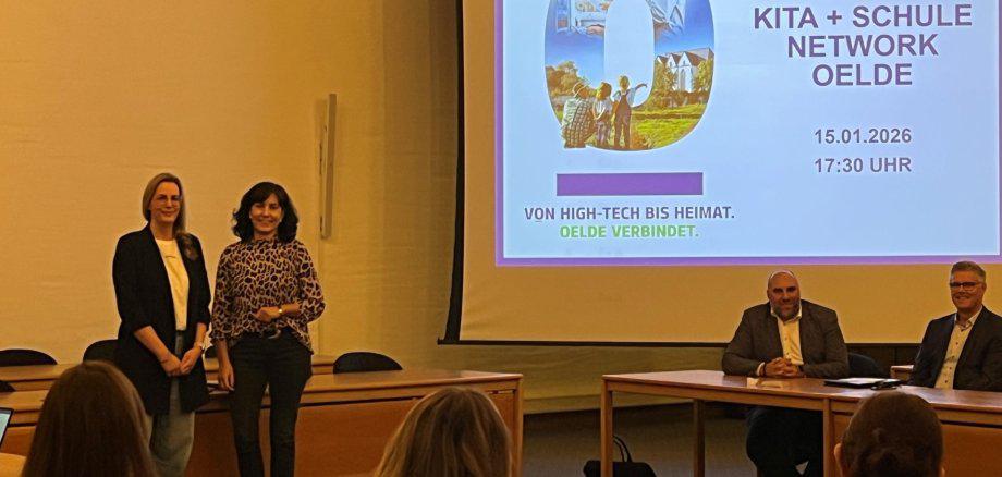 v.l. Nathalie Neuhaus (Vorsitzende Förderverein Overbergschule) und Annegret Beckemeyer (Stadt Oelde) führten die Teilnehmenden durch den Abend. Zu Gast waren auch Grigorius Salioras und Volker Brügge als Vertreter der Sparkasse Münsterland Ost.