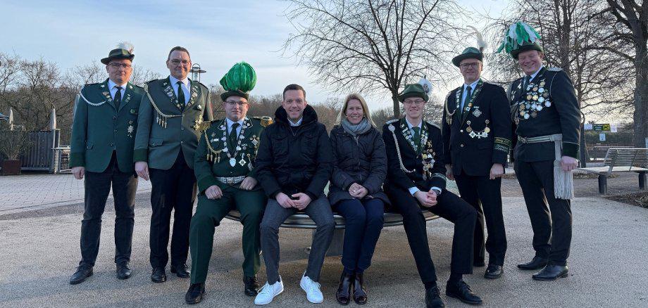 Das Kreisschützenfest findet am 3.10.2026 statt. Zu den Organisatoren gehören: (v.l.): Patrick Wesemann (LSV Ahmenhorst), Timo Lichte (Schützenverein Stromberg), René Zabel (Bürgerschützenverein St. Hubertus), Michael Kaupmann (Förderverein Vier-Jahreszeiten-Park e.V.), Melanie Wiebusch (Forum Oelde), Fabian Neitemeier (Schützenverein Sünninghausen), Dirk Lehmköster (Schützengilde Oelde) und Jochen Kobrink (Schützengesellschaft Oelde).
