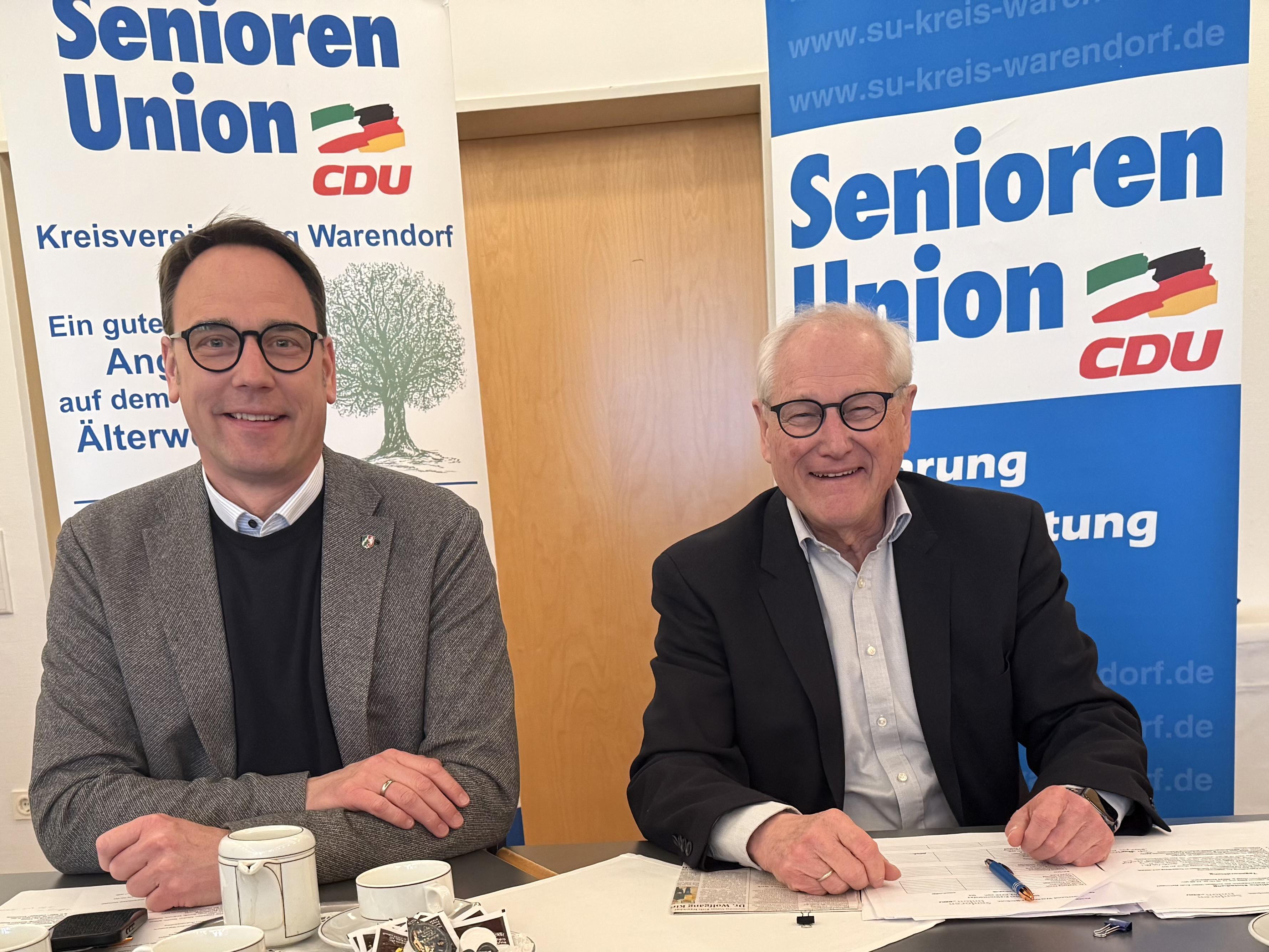 Die Landtagswahl im Mai 2027 kommt näher: Der Vorstand der Senioren Union der CDU hat sich auf seiner Sitzung in der „Waldmutter“ einstimmig für die erneute Kandidatur von Daniel Hagemeier und Markus Höner ausgesprochen: „Beide Abgeordnete machen eine gute Arbeit als Vertreter unseres Kreises im Landtag von Nordrhein-Westfalen, bürgernah und kompetent“, erklärte der Kreisvorsitzende der Senioren Union Dr. Wolfgang Kirsch nach einem intensiven Gespräch über aktuelle Fragen mit Markus Höner. Die Aufstellung der CDU-Kandidaten wird am 12. Juni 2026 in Everswinkel stattfinden.