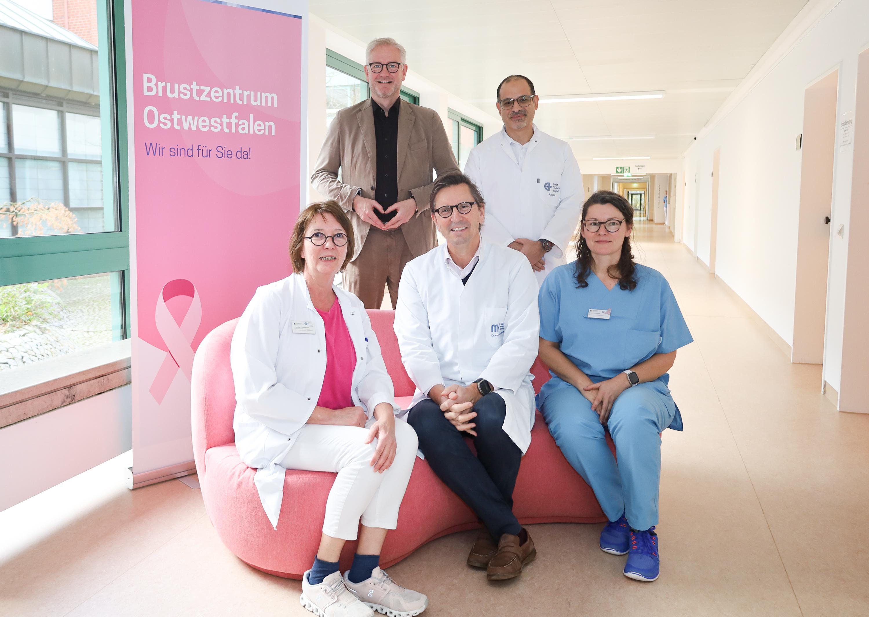 Neues gynäkologisches Angebot für Frauen in Oelde: Geschäftsführer Matthias Bitter (stehend von links), Khalil Lafta, Chefarzt der Klinik für Gynäkologie und Geburtshilfe, Marlies Grollmann (sitzend von links), Oberärztin der Klinik für Gynäkologie und Geburtshilfe, Nikolaus von Braunmühl, Chefarzt der Klinik für Plastische-, Ästhetische, Rekonstruktive- und Handchirurgie sowie Breast Care Nurse Nina Hövelmann.
