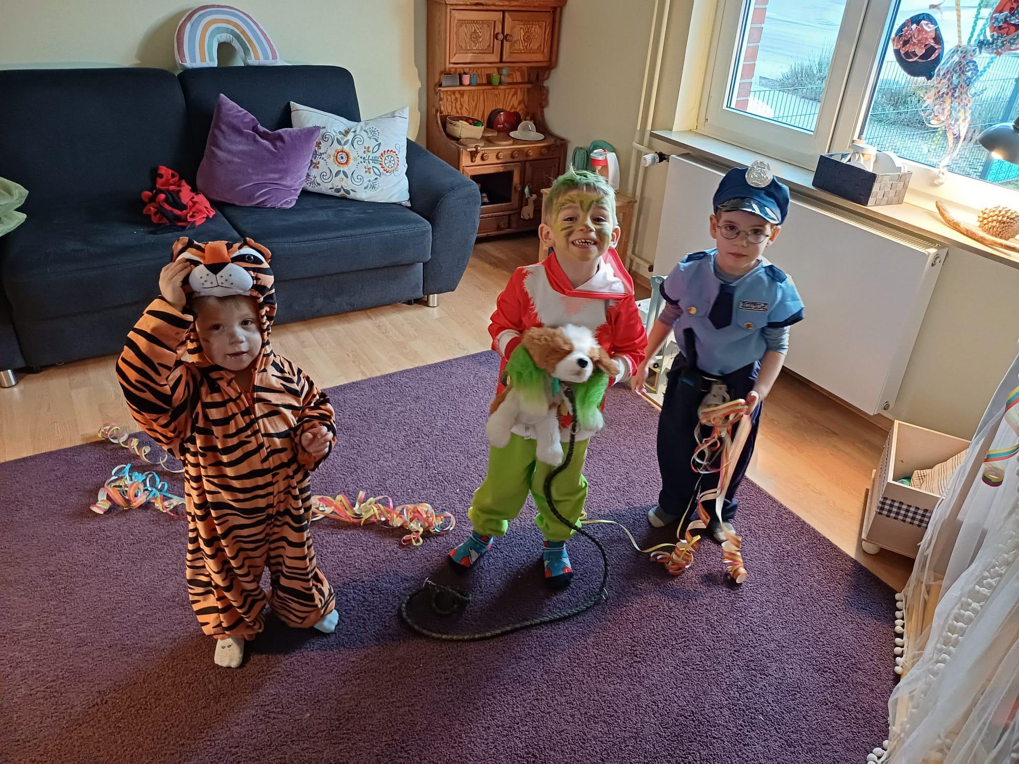 Die Kinder kamen in tollen Kostümen: Zwei Einhörner, ein Polizist, der Grinch, ein Frosch und ein Pinguin, ein Marienkäfer sowie ein Krokodil-Dino sorgten für eine kunterbunte Runde. Gemeinsam wurde getanzt, gelacht, Luftschlangen gepustet und die Verkleidungen im Kreis stolz präsentiert.
