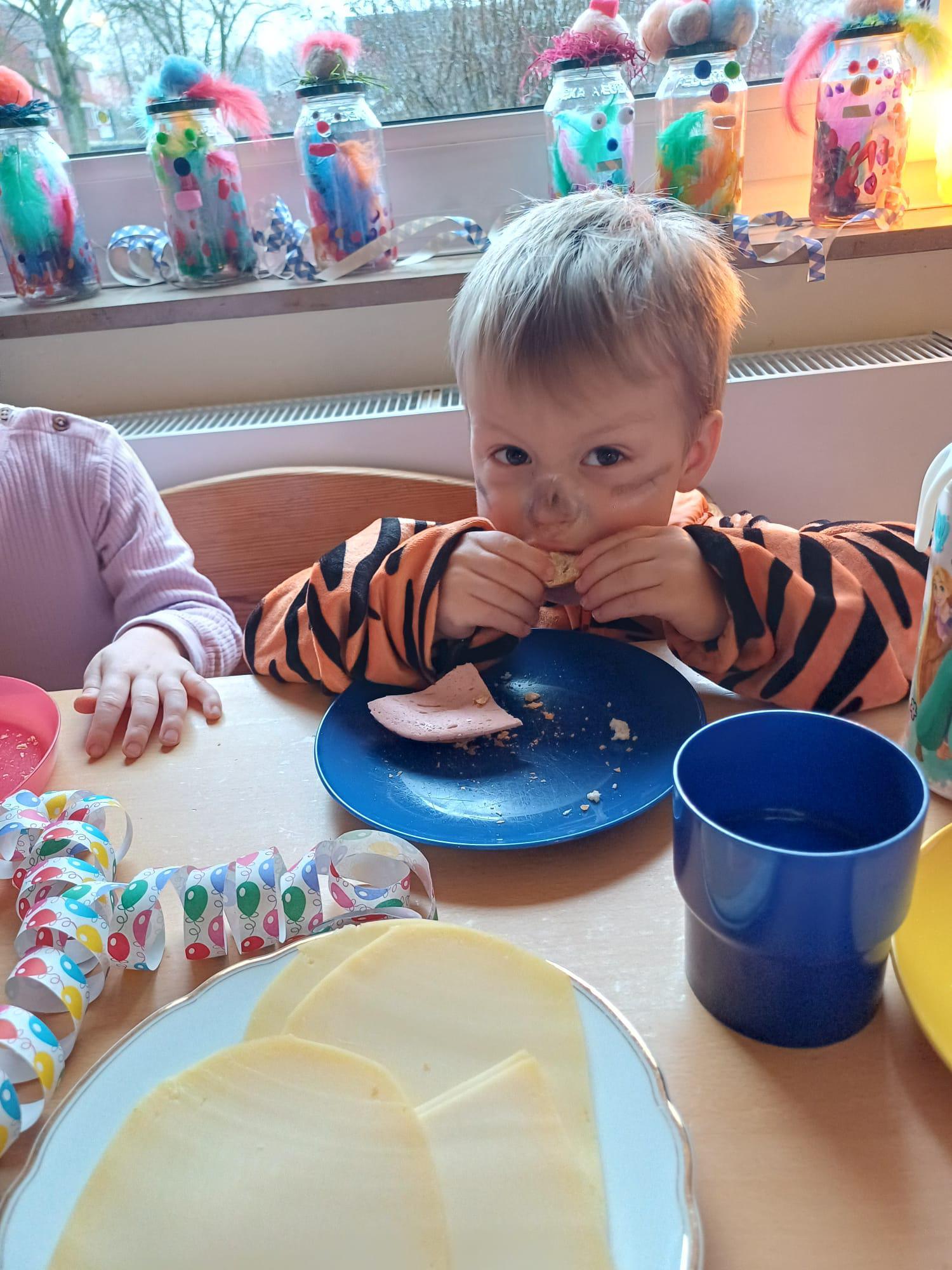 Für das leibliche Wohl war ebenfalls gesorgt: Zum Frühstück gab es Brötchen, Fleischwurst, Käse und Marmelade. Zusätzlich wurden Muffins von einer Unterstützerin und Berliner von einer Mutter spendiert. Ein besonderes Highlight wartete dann beim Mittagessen – passend zu den als Cheeseburger verkleideten Erzieherinnen gab es für die Kinder leckere Cheeseburger.