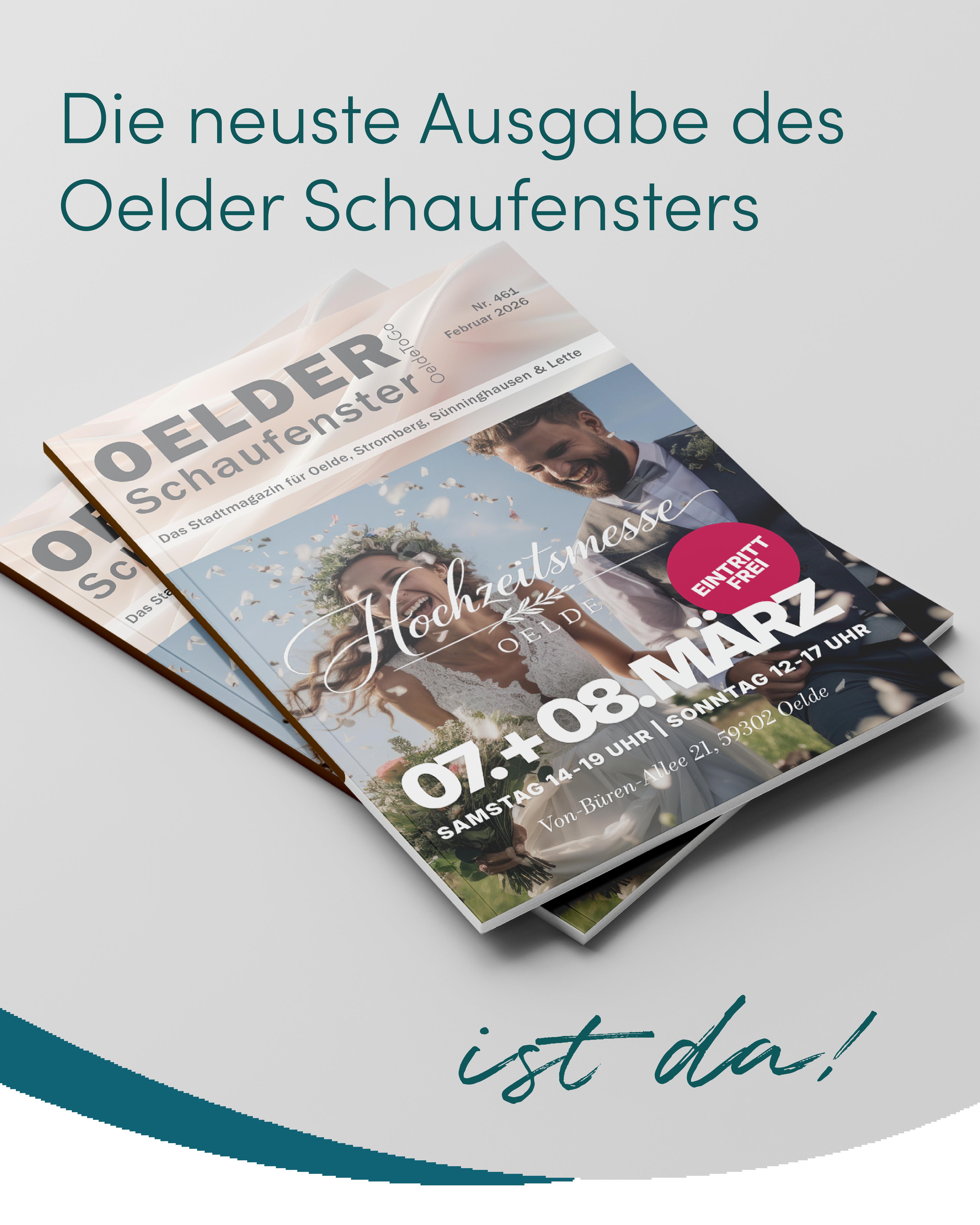 Aber natürlich Darüber hinaus berichtet die Ausgabe über weitere spannende Themen aus Oelde, Lette, Stromberg und Sünninghausen. Vereine geben Einblicke in ihre Arbeit, Entwicklungen und Veranstaltungen. Das Oelde Schaufenster bleibt damit die größte Vereinszeitschrift rund um unsere Stadt.