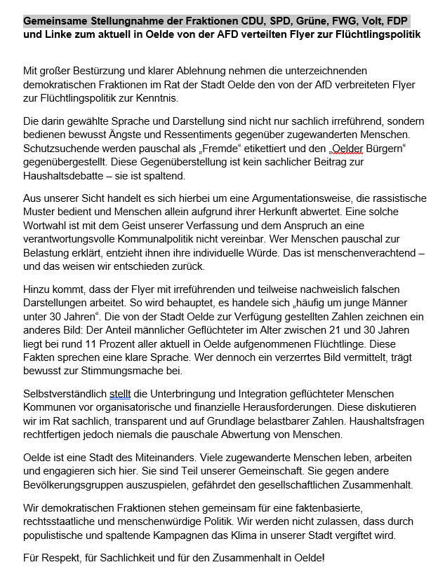 Gemeinsame Stellungnahme der Fraktionen CDU, SPD, Grüne, FWG, Volt, FDP und Linke zum aktuell in Oelde von der AFD verteilten Flyer zur Flüchtlingspolitik