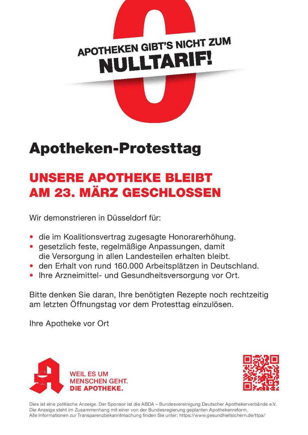 Grund ist ein bundesweiter Protesttag der Apotheken für ein faires Honorar und den Erhalt der wohnortnahen Versorgung. Auch die meisten Apothekenteams aus unserer Region nehmen an zentralen Kundgebungen teil.