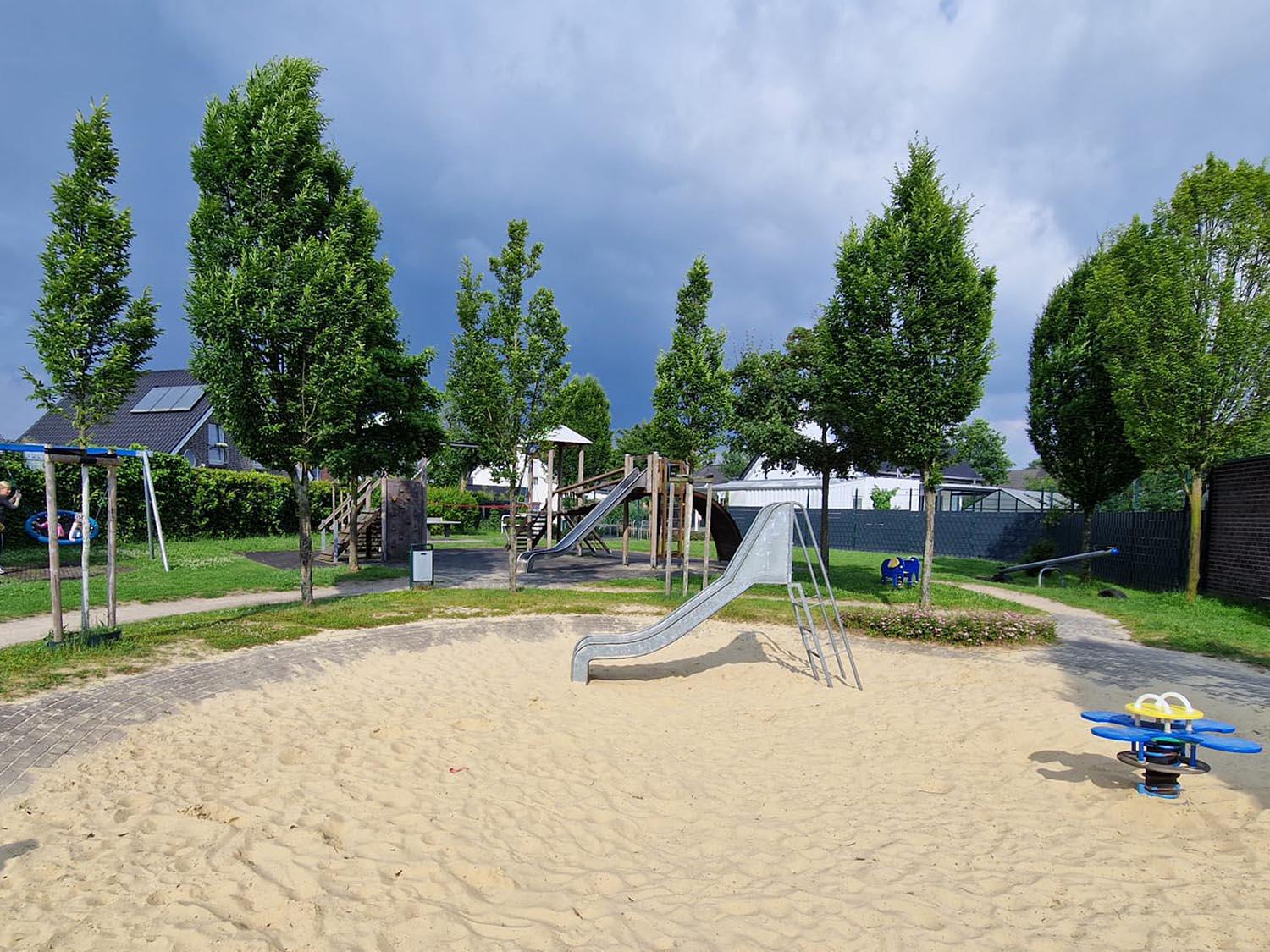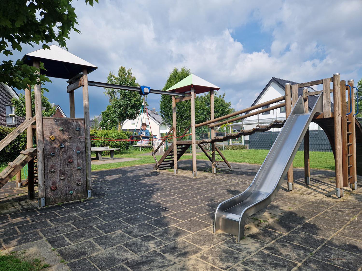 Die kleine Seilbahn, die zwei Türme eines Kletter-Spielgeräts verbindet, ist sicherlich ein Highlight der schönen Spielplatzanlage. Hier lässt es sich toben, klettern, Rutschen und im Sand spielen. Für die kleineren Besucher gibt es eine kleine Kinderrutsche, Wipptiere und eine gemütliche Nestschaukel, für die größeren Kinder steht auch eine Tischtennisplatte zur Verfügung. Wird es dann doch mal zu sonnig spenden viele Bäume Schatten. Kleiner Kritikpunkt: die Bänke für die erwachsenen Besucher sind eher unbequem, es gibt keine Lehne. Aber es gibt genügend Freiflächen, um es sich auf einer Picknickdecke gemütlich zu machen und den Spielplatzbesuch zu genießen!