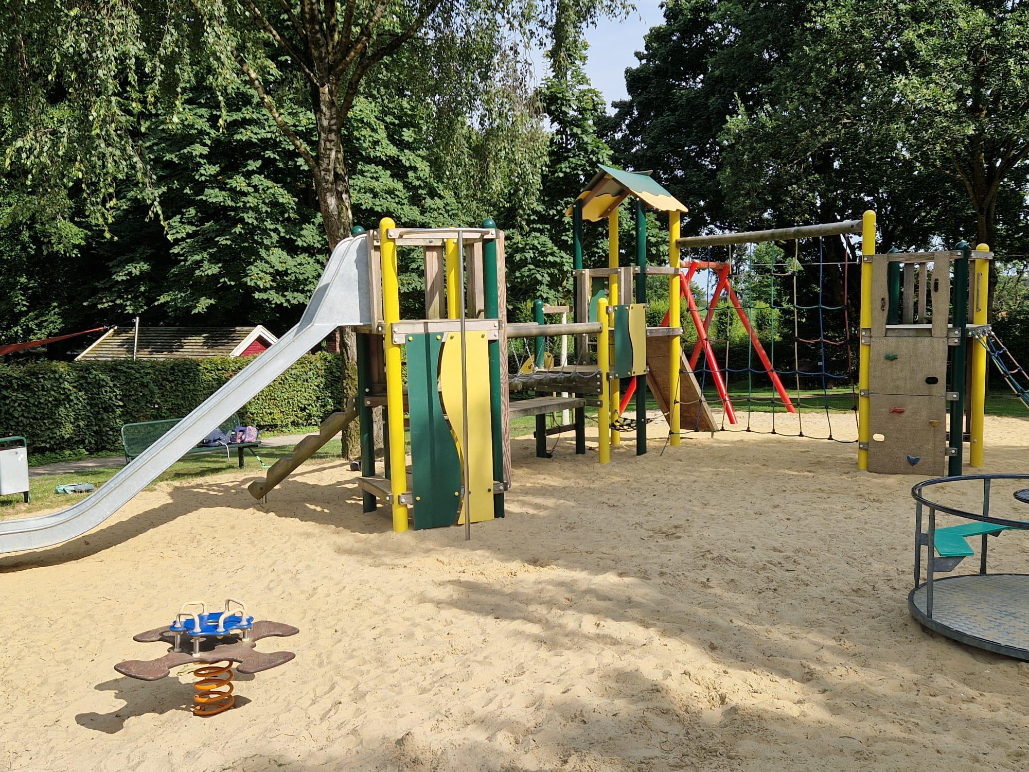 Auf einer großen Fläche erstreckt sich der Spielplatz in Sünninghausen, der sowoh für die kleinen als auch für die etwas größeren Besucher eine Menge zu bieten hat. Dabei sind die Spielgeräte für die Kleineren von denen für die Großen etwas entfernt in einem eigenen, kleinen Bereich platziert. Während die großen Kinder mit der kleinen Seilbahn hin- und herflitzen können oder sich auf dem Klettergerät mit Rutsche ausprobieren können die Jüngeren auf dem Sandplatz in Rufweite in der Nestschaukel relaxen, auf den Wipptieren schaukeln oder von der kleinen Rutsche runterflitzen. Für die Erwachsenen gibt es genügend Sitzplätze - auch im Schatten und auf der weiträumigen Rasenfläche kann man auch wunderbar die Zeit auf einer Picknickdecke verbringen.