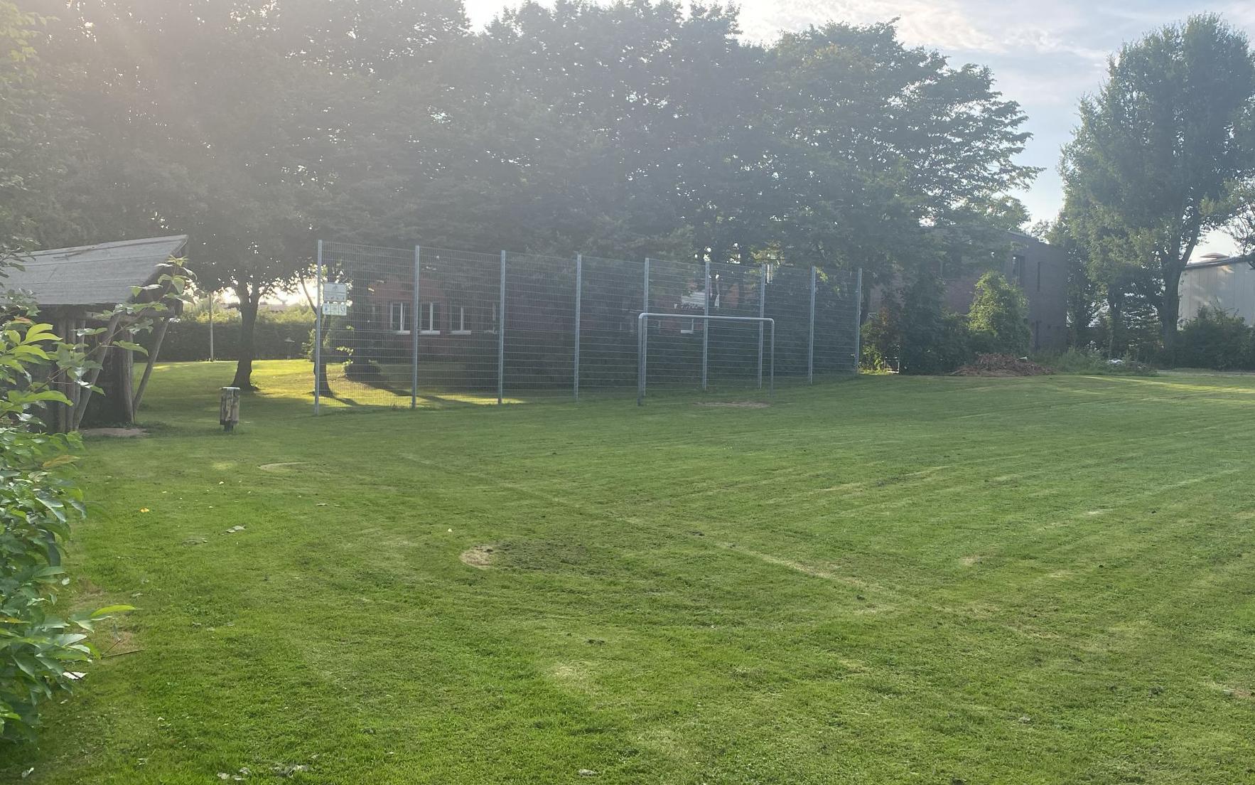 Die Rasenfläche bietet ausreichend Platz für fußballtricksende Mädchen und Jungen. Hinter den Toren gibt es Ballfangnetze, so dass einem torreichen Spiel nichts im Wege steht.